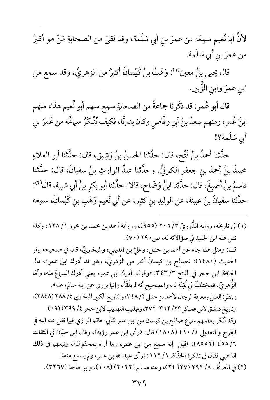 قلنا: ومثل هذا جاء عن أحمد بن حنبل، وعليّ بن المديني، والبخاريِّ، قال في صحيحه بإثر الحديث (١٤٨٠): "صالح بن كيسانَ أكبر من الزُّهريّ، وهو قد أدرك ابنَ عمر"، قال الحافظ ابن حجر في الفتح ٣/ ٣٤٣: "وقوله: أدرك ابن عمر؛ يعني أدرك السماعَ منه، وأمّا الزُّهريّ، فمختلفٌ في لُقِيِّه له، والصحيح أنه لم يلْقَهُ، وإنما يروي عن ابنه سالم، عنه".