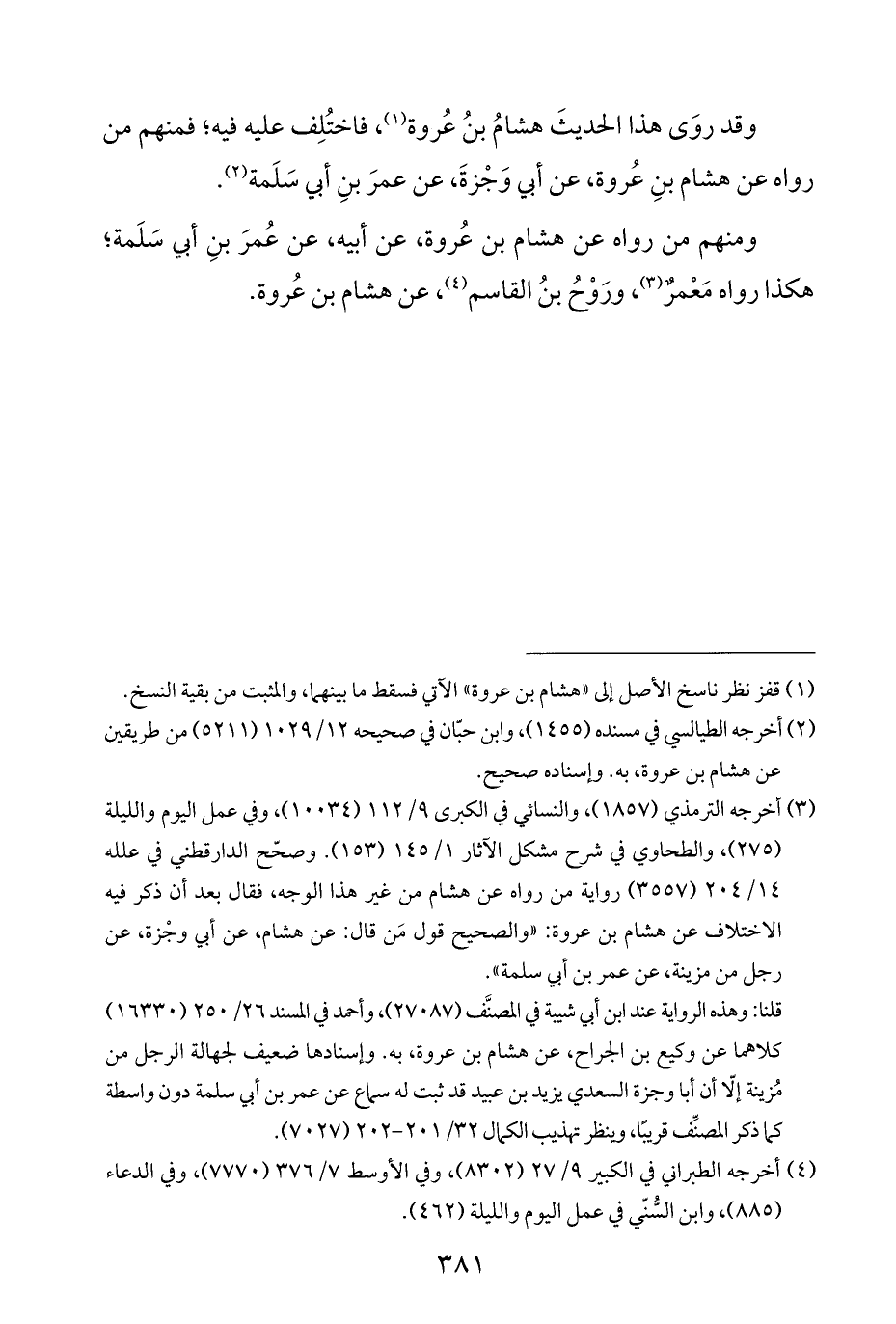 (¬٣) أخرجه الترمذي (١٨٥٧)، والنسائي في الكبرى ٩/ ١١٢ (١٠٠٣٤)، وفي عمل اليوم والليلة (٢٧٥)، والطحاوي في شرح مشكل الآثار ١/ ١٤٥ (١٥٣). وصحّح الدارقطني في علله ١٤/ ٢٠٤ (٣٥٥٧) رواية من رواه عن هشام من غير هذا الوجه، فقال بعد أن ذكر فيه الاختلاف عن هشام بن عروة: "والصحيح قول مَن قال: عن هشام، عن أبي وجْزة، عن رجل من مزينة، عن عمر بن أبي سلمة".