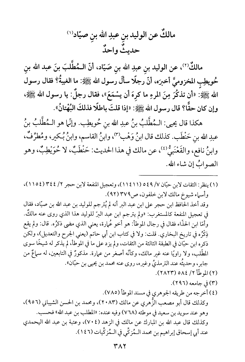 مالكٌ (¬٢)، عن الوليد بنِ عبدِ الله بنِ صَيّاد، أنّ المُطَّلبَ بنَ عبد الله بنِ حُويطِبٍ المخزوميَّ أخبرَه، أنّ رجلًا سألَ رسول الله - صلى الله عليه وسلم -: ما الغيبةُ؟ فقال رسول الله - صلى الله عليه وسلم - "أن تذكُرَ مِنَ المرءِ ما كرِهَ أن يسْمَعَ"، فقال رجل: يا رسول الله - صلى الله عليه وسلم -، وإن كان حقًّا؟ قال رسول الله - صلى الله عليه وسلم -: "إذا قلتَ باطلًا فذلكَ البُهْتانُ".