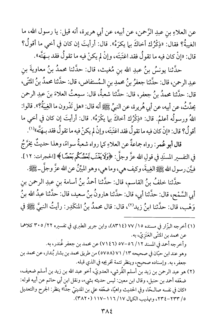 حدَّثنا يونسُ بنُ عبدِ الله بنِ مُغيث، قال: حدَّثنا محمدُ بنُ معاويةَ بنِ عبدِ الرحمن، قال: حدَّثنا جعفرُ بنُ محمدِ بنِ المُستفاض، قال: حدَّثنا محمدُ بنُ المثنّى، قال: حدَّثنا محمدُ بنُ جعفر، قال: حدَّثنا شعبةُ، قال: سمِعتُ العلاءَ بنَ عبدِ الرحمن يحدِّثُ، عن أبيه، عن أبي هُريرة، عن النبيِّ - صلى الله عليه وسلم - أنه قال: "هل تَدْرون ما الغِيبَةُ؟ ". قالوا: اللهُ ورسولُه أعلمُ. قال: "ذِكْرُك أخاكَ بما يكْرَهُ". قال: أرأيتَ إن كان في أخي ما أقولُ؟ قال: "إنْ كان فيه ما تقولُ فقد اغتَبتَه، وإنْ لم يكنْ فيه ما تقولُ فقد بهَتَّه" (¬١).