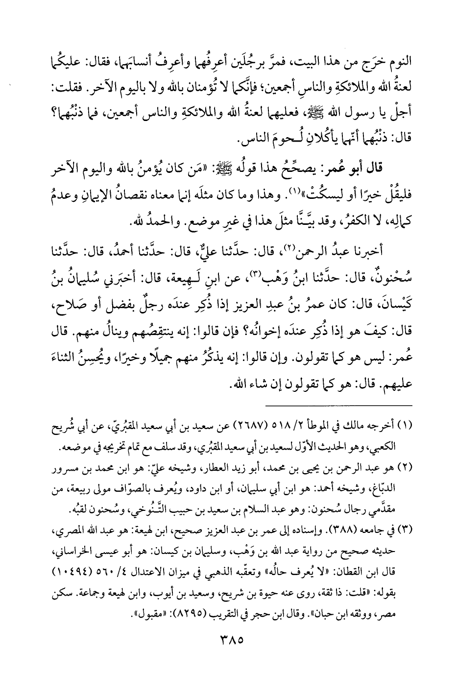 قال أبو عُمر: يصحِّحُ هذا قولُه - صلى الله عليه وسلم -: "مَن كان يُؤمنُ بالله واليوم الآخر فليقُلْ خيرًا أو ليسكُتْ" (¬١). وهذا وما كان مثلَه إنما معناه نقصانُ الإيمانِ وعدمُ كمالِه، لا الكفرُ، وقد بيَّنَّا مثلَ هذا في غيرِ موضع. والحمدُ لله.