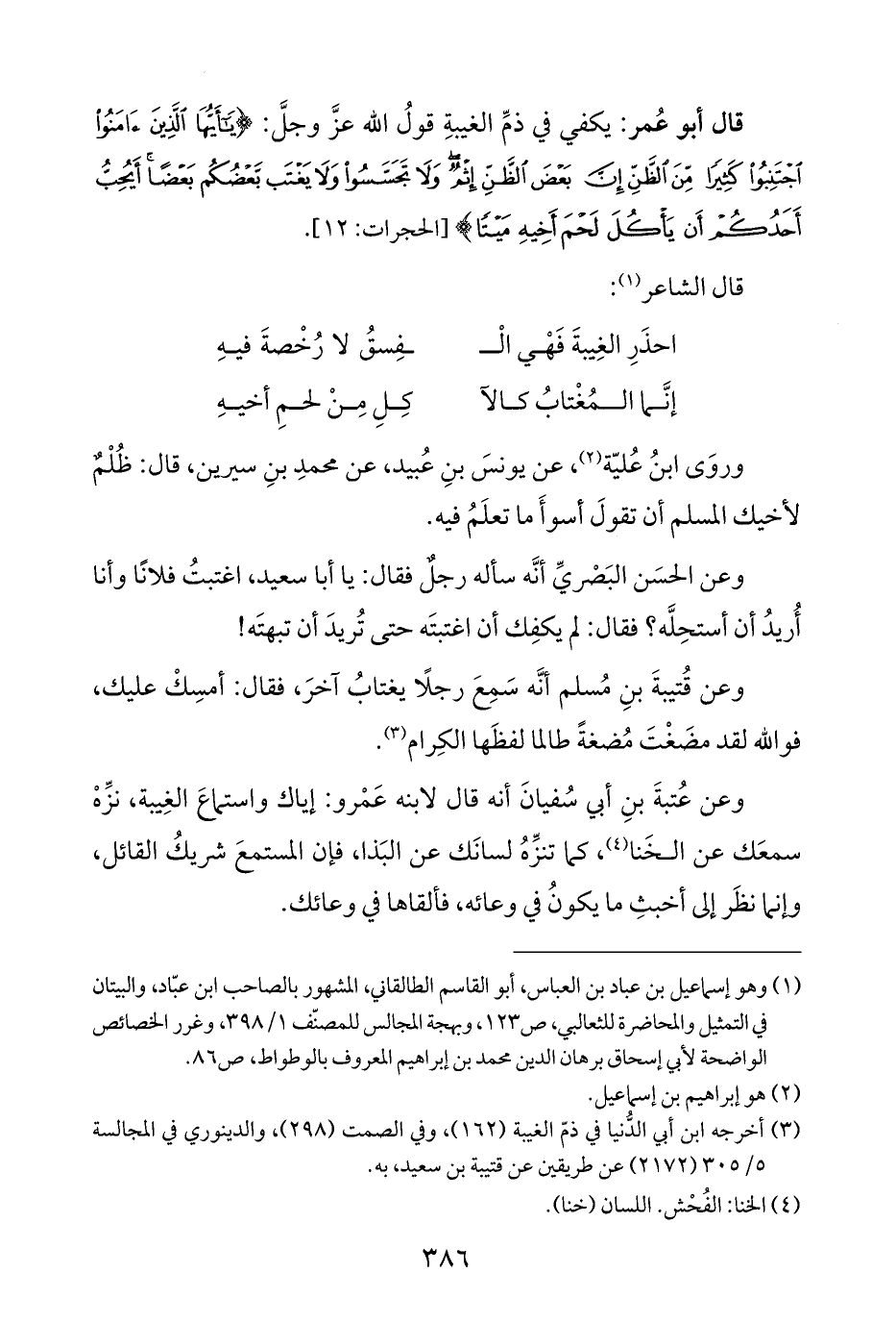 (¬٣) أخرجه ابن أبي الدُّنيا في ذمّ الغيبة (١٦٢)، وفي الصمت (٢٩٨)، والدينوري في المجالسة ٥/ ٣٠٥ (٢١٧٢) عن طريقين عن قتيبة بن سعيد، به.
