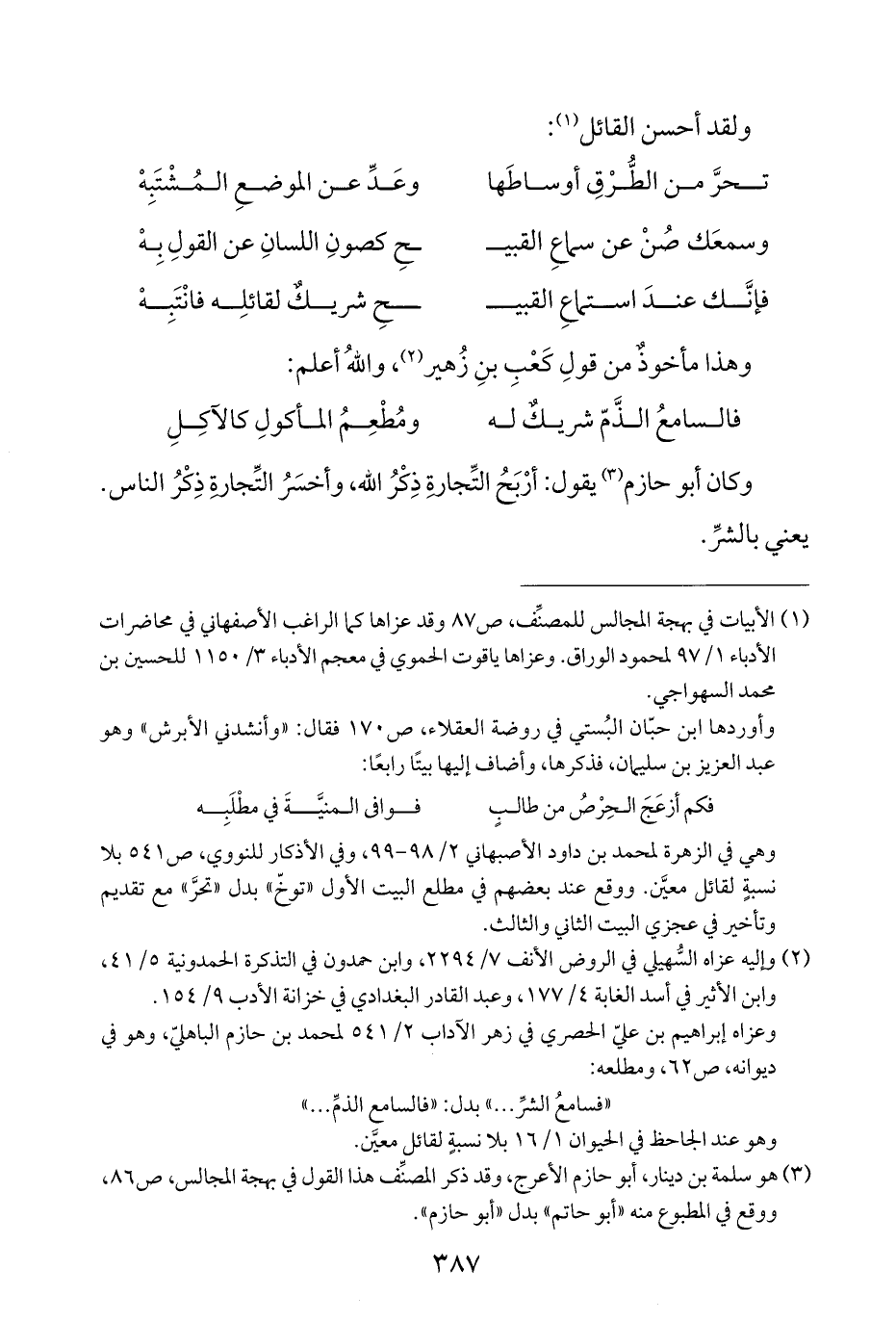 (¬١) الأبيات في بهجة المجالس للمصنِّف، ص ٨٧ وقد عزاها كما الراغب الأصفهاني في محاضرات الأدباء ١/ ٩٧ لمحمود الوراق. وعزاها ياقوت الحموي في معجم الأدباء ٣/ ١١٥٠ للحسين بن محمد السهواجي.