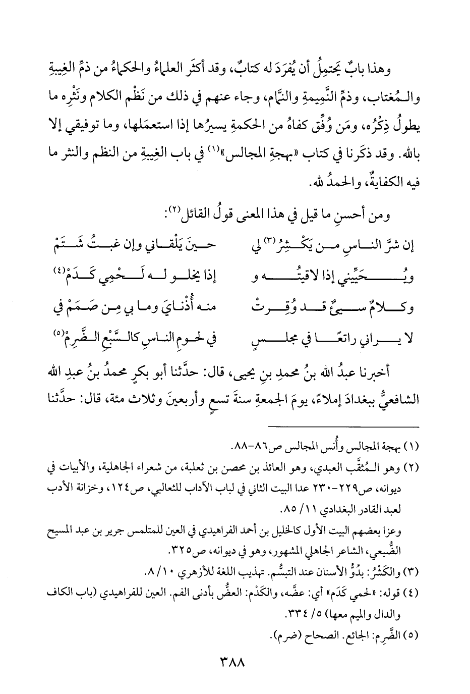 وهذا بابٌ يَحتمِلُ أن يُفرَدَ له كتابٌ، وقد أكثَر العلماءُ والحكماءُ من ذمِّ الغِيبةِ والمُغتاب، وذمِّ النَّمِيمةِ والنمَّام، وجاء عنهم في ذلك من نَظْم الكلام ونَثْرِه ما يطولُ ذِكْرُه، ومَن وُفِّق كفاهُ من الحكمةِ يسيرُها إذا استعمَلها، وما توفيقي إلا بالله. وقد ذكَرنا في كتاب "بهجةِ المجالس" (¬١) في باب الغِيبةِ من النظم والنثر ما فيه الكفايةٌ، والحمدُ لله.