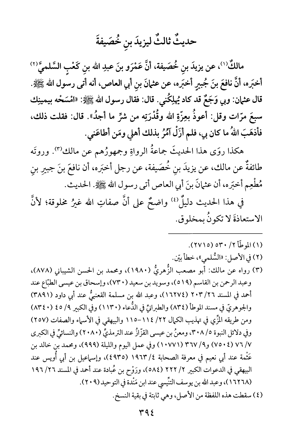 مالكٌ (¬١)، عن يزيدَ بنِ خُصَيفة، أنَّ عَمْرَو بنَ عبدِ الله بنِ كَعْبٍ السَّلميَّ (¬٢) أخبَره، أنَّ نافعَ بنَ جُبيرٍ أخبَره، عن عثمانَ بنِ أبي العاص، أنه أتى رسول الله - صلى الله عليه وسلم -. قال عثمان: وبي وَجَعٌ قد كاد يُهلِكُني. قال: فقال رسول الله - صلى الله عليه وسلم -: "امْسَحْه بيمينِك سبعَ مرّات وقل: أعوذُ بعِزّةِ الله وقُدْرَته من شرِّ ما أجدُ". قال: فقلت ذلك، فأذهَبَ اللهُ ما كان بي، فلم أزَلْ آمُرُ بذلك أهلي ومَن أطاعَني.