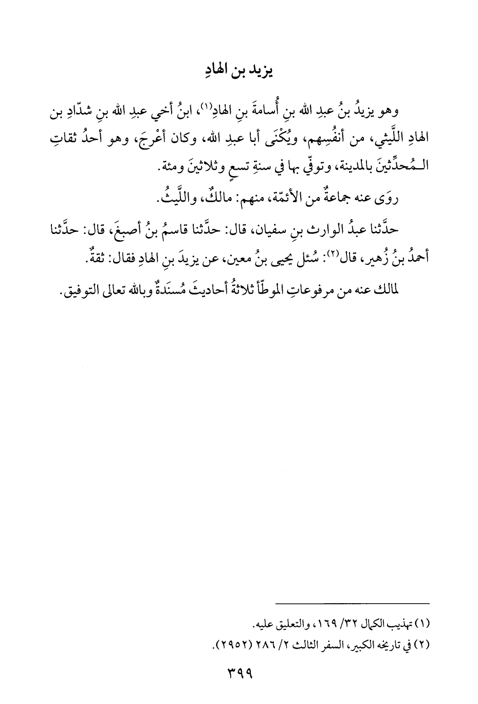 وهو يزيدُ بنُ عبدِ الله بنِ أُسامةَ بنِ الهادِ (¬١)، ابنُ أخي عبدِ الله بنِ شدّادِ بن الهادِ اللَّيثي، من أنفُسِهم، ويُكْنَى أبا عبدِ الله، وكان أعْرجَ، وهو أحدُ ثقاتِ المُحدِّثينَ بالمدينة، وتوفّي بها في سنةِ تسعٍ وثلاثينَ ومئة.
