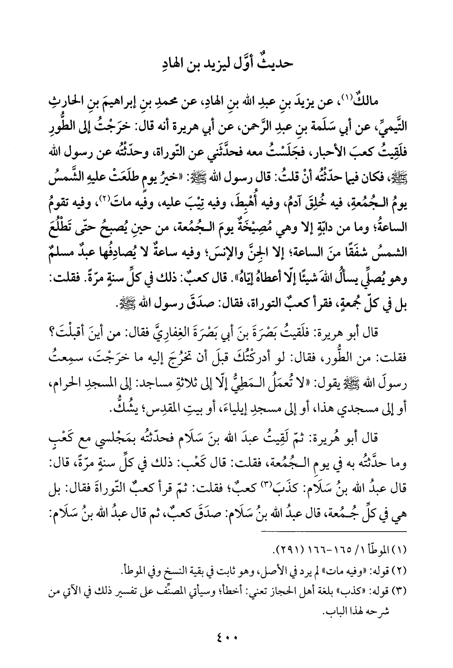 مالكٌ (¬١)، عن يزيدَ بنِ عبدِ الله بنِ الهادِ، عن محمدِ بنِ إبراهيمَ بنِ الحارثِ التَّيميِّ، عن أبي سَلَمة بنِ عبدِ الرَّحمن، عن أبي هريرة أنه قال: خرَجْتُ إلى الطُّورِ فلَقِيتُ كعبَ الأحبار، فجَلَسْتُ معه فحدَّثَني عن التّوراة، وحدّثْتُه عن رسول الله - صلى الله عليه وسلم -، فكان فيما حدّثْتُه أنْ قلتُ: قال رسول الله - صلى الله عليه وسلم -: "خيرُ يومٍ طلَعَتْ عليه الشَّمس يومُ الجُمُعةِ، فيه خُلِقَ آدمُ، وفيه أُهْبِطَ، وفيه تِيْبَ عليه، وفيه ماتَ (¬٢)، وفيه تقومُ الساعةُ؛ وما من دابّةٍ إلا وهي مُصِيْخَةٌ يومَ الجُمُعة، من حينِ يُصبحُ حتَّى تَطْلُعَ الشمسُ شفَقًا منَ الساعة؛ إلا الجِنَّ والإنسَ؛ وفيه ساعةٌ لا يُصادِفُها عبدٌ مسلمٌ وهو يُصلِّي يسأل اللهَ شيئًا إلّا أعطاهُ إيَّاهُ". قال كعبٌ: ذلك في كلِّ سنةٍ مرّةً. فقلت: بل في كلّ جُمعةٍ، فقرأ كعبٌ التوراة، فقال: صدَقَ رسول الله - صلى الله عليه وسلم -.