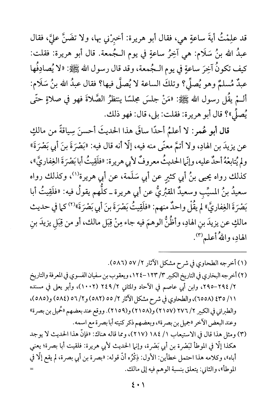 قال أبو عُمر: لا أعلمُ أحدًا ساقَ هذا الحديثَ أحسنَ سِياقةً من مالكٍ عن يزيدَ بن الهادِ، ولا أتمَّ معنًى منه فيه، إلّا أنه قال فيه: "بَصْرَةَ بنَ أبي بَصْرَةَ" ولم يُتابعْهُ أحد عليه، وإنّما الحديثُ معروفٌ لأبي هريرة: "فلَقِيتُ أبا بَصْرَةَ الغِفاريَّ"، كذلك رواه يحيى بنُ أبي كثيرٍ عن أبي سَلَمة، عن أبي هريرة (¬١)، وكذلك رواه سعيدُ بنُ المسيِّبِ وسعيد المقبُريُّ عن أبي هريرة - كلُّهم يقولُ فيه: "فلَقِيتُ أبا بَصْرَةَ الغِفاريَّ" لم يقُلْ واحد منهم: "فلَقِيتُ بَصْرَةَ بنَ أبي بَصْرَةَ" (¬٢) كما في حديث مالكٍ عن يزيدَ بنِ الهادِ، وأظُنُّ الوهمَ فيه جاء مِنْ قِبَل مالك، أو من قِبَلِ يزيدَ بنِ الهادِ، واللهُ أعلم (¬٣).