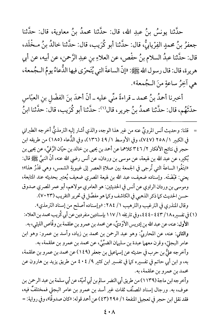 حدَّثنا يونسُ بنُ عبدِ الله، قال: حدَّثنا محمدُ بنُ معاوية، قال: حدَّثنا جعفرُ بنُ محمدٍ الفِرْيابيُّ، قال: حدَّثنا أبو كُرَيب، قال: حدَّثنا خالدُ بنُ مخْلَد، قال: حدَّثنا عبدُ السلام بنُ حفْص، عن العلاءِ بنِ عبدِ الرَّحمن، عن أبيه، عن أبي هريرة، قال: قال رسول الله - صلى الله عليه وسلم -: "إنّ الساعةَ التي يُتَحرّى فيها الدُّعاءُ يومُ الجُمعة، هي آخِرُ ساعةٍ منَ الجُمعة".