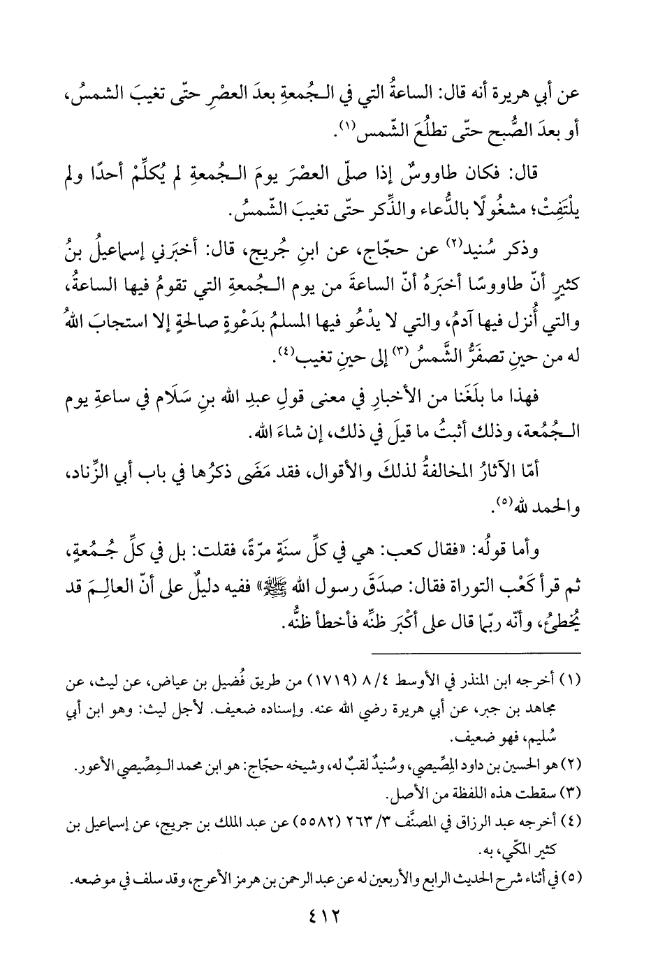 فهذا ما بلَغَنا من الأخبارِ في معنى قولِ عبدِ الله بنِ سَلَام في ساعةِ يوم الجُمُعة، وذلك أثبتُ ما قيلَ في ذلك، إن شاءَ الله.