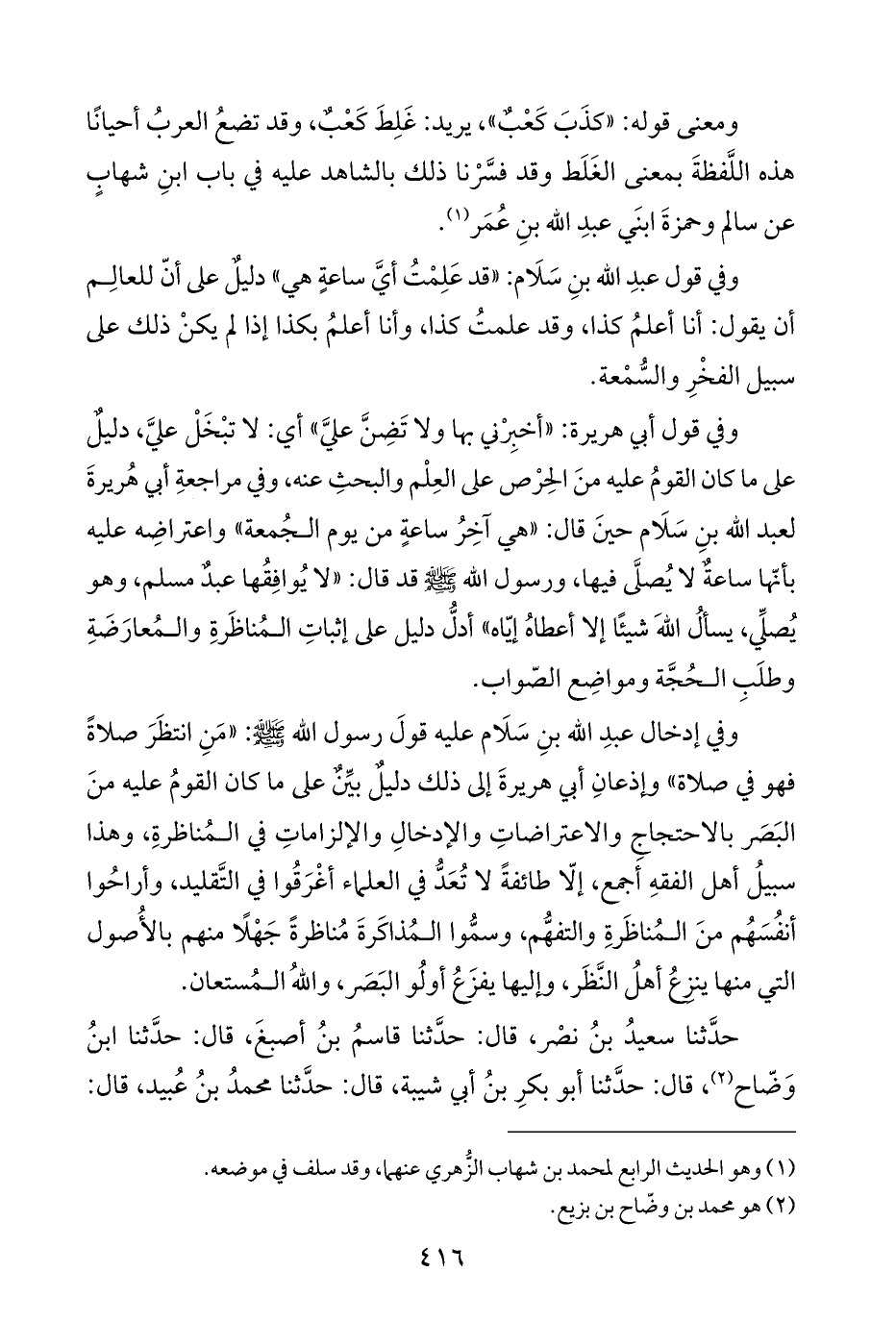 وفي إدخال عبدِ الله بنِ سَلَام عليه قولَ رسول الله - صلى الله عليه وسلم -: "مَنِ انتظَرَ صلاةً فهو في صلاة" وإذعانِ أبي هريرةَ إلى ذلك دليلٌ بيِّنٌ على ما كان القومُ عليه منَ البَصَر بالاحتجاجِ والاعتراضاتِ والإدخالِ والإلزاماتِ في المُناظرةِ، وهذا سبيلُ أهل الفقهِ أجمع، إلّا طائفةً لا تُعَدُّ في العلماء أغْرَقُوا في التَّقليد، وأراحُوا أنفُسَهُم منَ المُناظَرةِ والتفهُّم، وسمُّوا المُذاكَرةَ مُناظرةً جَهْلًا منهم بالأُصول التي منها ينزعُ أهلُ النَّظَر، وإليها يفزَعُ أولُو البَصَر، واللهُ المُستعان.