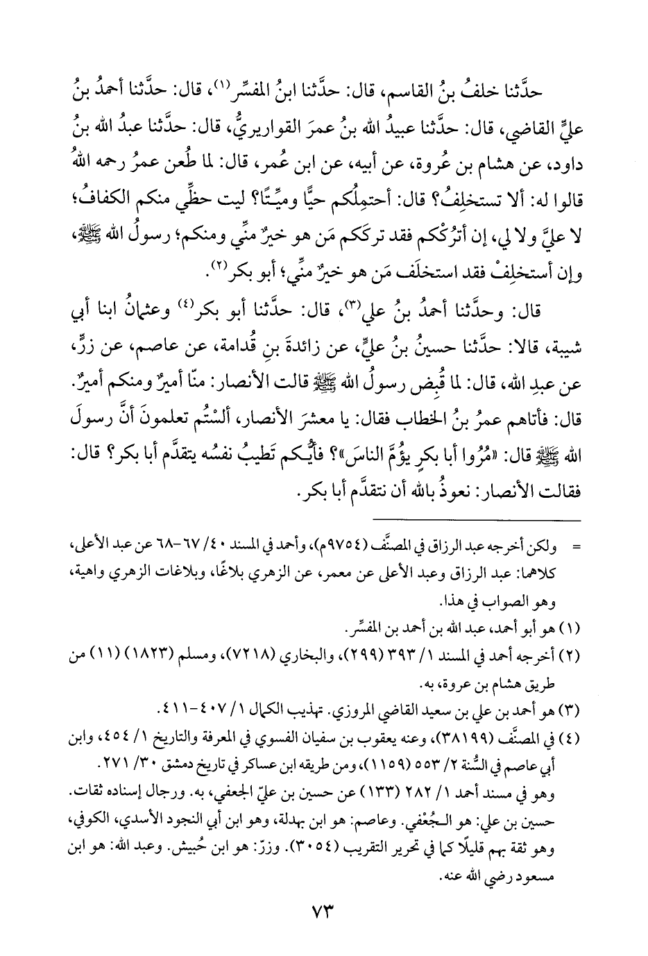 قال: وحدَّثنا أحمدُ بنُ علي (¬٣)، قال: حدَّثنا أبو بكر (¬٤) وعثمانُ ابنا أبي شيبة، قالا: حدَّثنا حسينُ بنُ عليٍّ، عن زائدةَ بنِ قُدامة، عن عاصم، عن زرٍّ، عن عبدِ اللَّه، قال: لما قُبِض رسولُ اللَّه -صلى اللَّه عليه وسلم- قالت الأنصار: منّا أميرٌ ومنكم أميرٌ. قال: فأتاهم عمرُ بنُ الخطاب فقال: يا معشرَ الأنصار، ألسْتُم تعلمونَ أنَّ رسولَ اللَّه -صلى اللَّه عليه وسلم- قال: "مُرُوا أبا بكرٍ يؤُمَّ الناسَ"؟ فأيُّكم تَطيبُ نفسُه يتقدَّم أبا بكر؟ قال: فقالت الأنصار: نعوذُ باللَّه أن نتقدَّم أبا بكر.