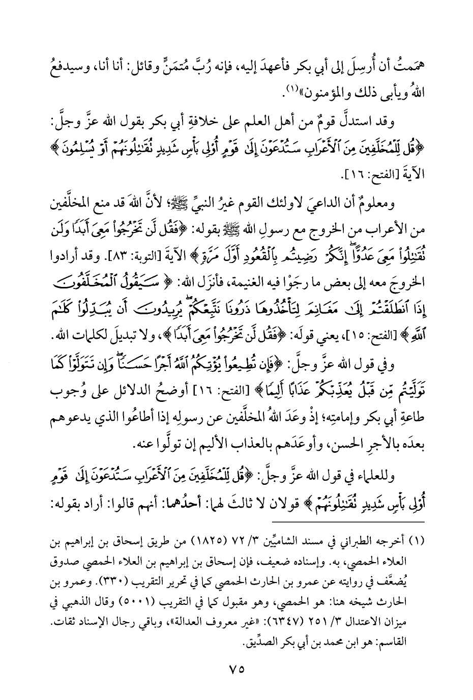 وفي قول اللَّه عزَّ وجلَّ: {فَإِنْ تُطِيعُوا يُؤْتِكُمُ اللَّهُ أَجْرًا حَسَنًا وَإِنْ تَتَوَلَّوْا كَمَا تَوَلَّيْتُمْ مِنْ قَبْلُ يُعَذِّبْكُمْ عَذَابًا أَلِيمًا} [الفتح: ١٦] أوضحُ الدلائل على وُجوب طاعةِ أبي بكر وإمامتِه؛ إذْ وعَدَ اللَّهُ المخلَّفين عن رسولِه إذا أطاعُوا الذي يدعوهم بعدَه بالأجرِ الحسن، وأوعَدَهم بالعذاب الأليم إن تولَّوا عنه.