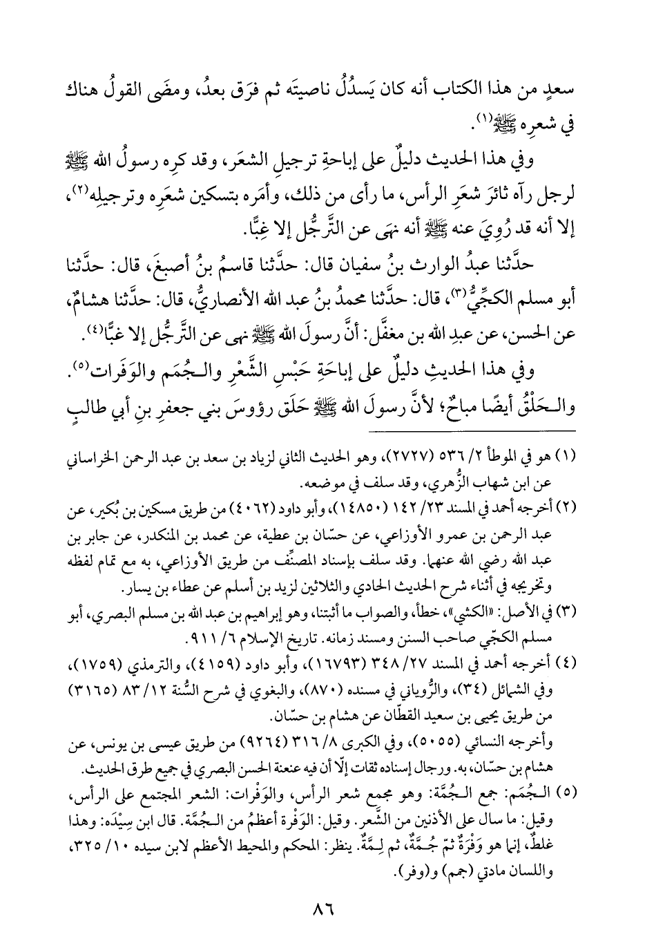 وفي هذا الحديثِ دليلٌ على إباحَةِ حَبْسِ الشَّعْرِ والجُمَم والوَفَرات (¬٥). والحَلْقُ أيضًا مباحٌ؛ لأنَّ رسولَ اللَّه -صلى اللَّه عليه وسلم- حَلَق رؤوسَ بني جعفرِ بنِ أبي طالبٍ