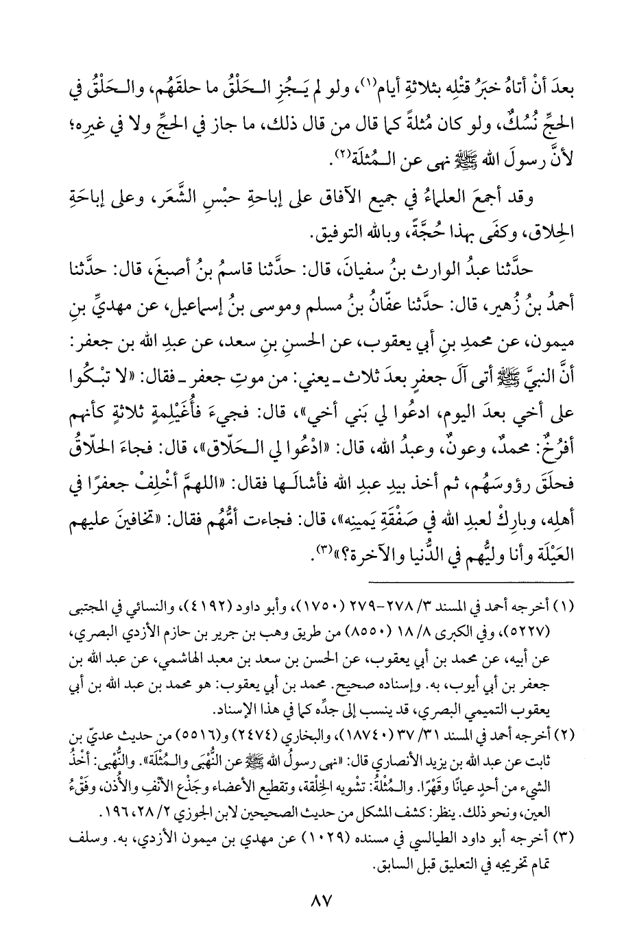 حدَّثنا عبدُ الوارث بنُ سفيانَ، قال: حدَّثنا قاسمُ بنُ أصبغَ، قال: حدَّثنا أحمدُ بنُ زُهير، قال: حدَّثنا عفّانُ بنُ مسلم وموسى بنُ إسماعيل، عن مهديِّ بنِ ميمون، عن محمدِ بنِ أبي يعقوب، عن الحسنِ بنِ سعد، عن عبدِ اللَّه بن جعفر: أنَّ النبيَّ -صلى اللَّه عليه وسلم- أتى آلَ جعفرٍ بعدَ ثلاث -يعني: من موتِ جعفر- فقال: "لا تبْكُوا على أخي بعدَ اليوم، ادعُوا لي بَني أخي"، قال: فجيءَ فأُغَيْلِمةٍ ثلاثةٍ كأنهم أفرُخٌ: محمدٌ، وعونٌ، وعبدُ اللَّه، قال: "ادْعُوا لي الحَلّاق"، قال: فجاءَ الحلّاقُ فحلَقَ رؤوسَهُم، ثم أخذ بيدِ عبدِ اللَّه فأشالَها فقال: "اللهمَّ أخْلِفْ جعفرًا في أهلِه، وبارِكْ لعبدِ اللَّه في صَفْقَةِ يَمينِه"، قال: فجاءت أمُّهُم فقال: "تخافينَ عليهم العَيْلَة وأنا وليُّهم في الدُّنيا والآخرة؟ " (¬٣).