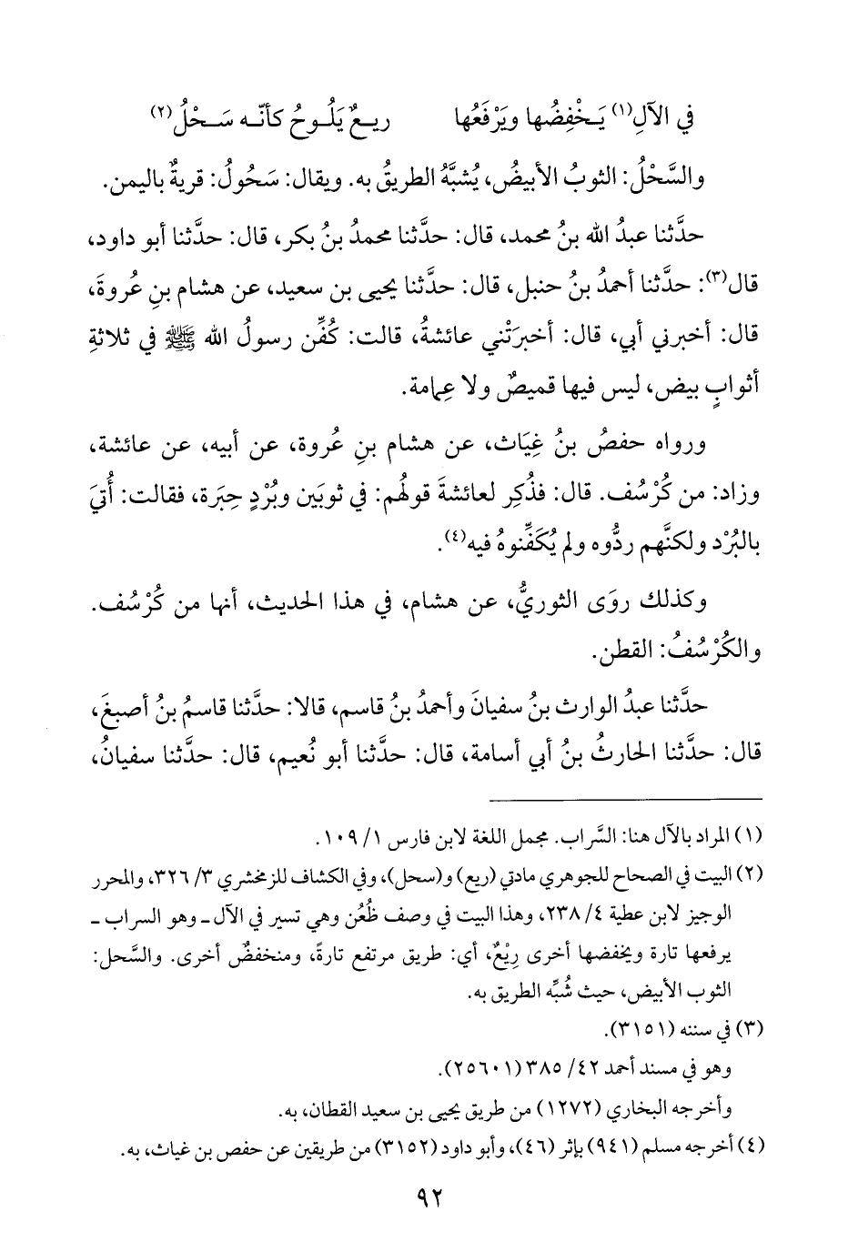 حدَّثنا عبدُ اللَّه بنُ محمد، قال: حدَّثنا محمدُ بنُ بكر، قال: حدَّثنا أبو داود، قال (¬٣): حدَّثنا أحمدُ بنُ حنبل، قال: حدَّثنا يحيى بن سعيد، عن هشام بنِ عُروةَ، قال: أخبرني أبي، قال: أخبرَتْني عائشةُ، قالت: كُفِّن رسولُ اللَّه -صلى اللَّه عليه وسلم- في ثلاثةِ أثوابٍ بيض، ليس فيها قميصٌ ولا عِمامة.