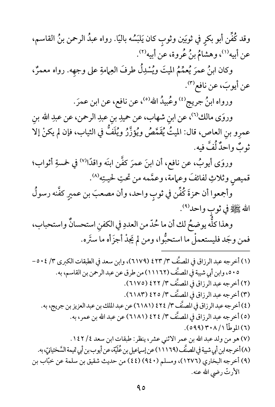 وروَى مالك (¬٦)، عن ابنِ شهاب، عن حميدِ بنِ عبدِ الرحمن، عن عبدِ اللَّه بنِ عمرِو بنِ العاص، قال: الميتُ يُقَمَّصُ ويُؤزَّرُ ويُلَفُّ في الثياب، فإن لم يكنْ إلَّا ثوبٌ واحدٌ لُفَّ فيه.