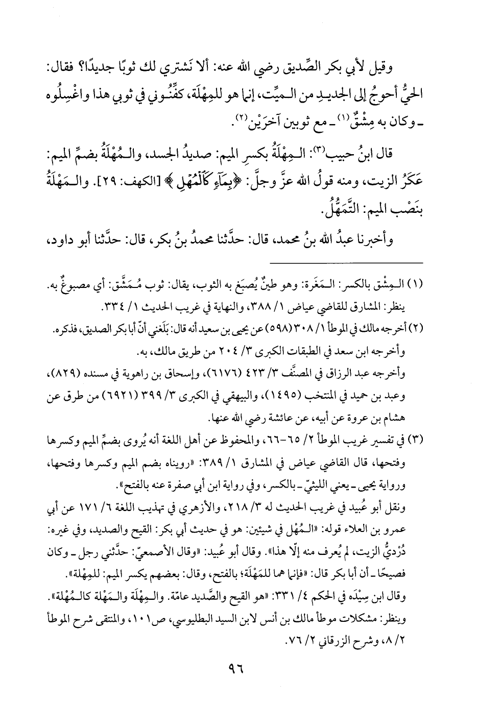 (¬٣) في تفسير غريب الموطأ ٢/ ٦٥ - ٦٦، والمحفوظ عن أهل اللغة أنه يُروى بضمِّ الميم وكسرها وفتحها، قال القاضي عياض في المشارق ١/ ٣٨٩: "رويناه بضم الميم وكسرها وفتحها، ورواية يحيى -يعني الليثيّ- بالكسر، وفي رواية ابن أبي صفرة عنه بالفتح".