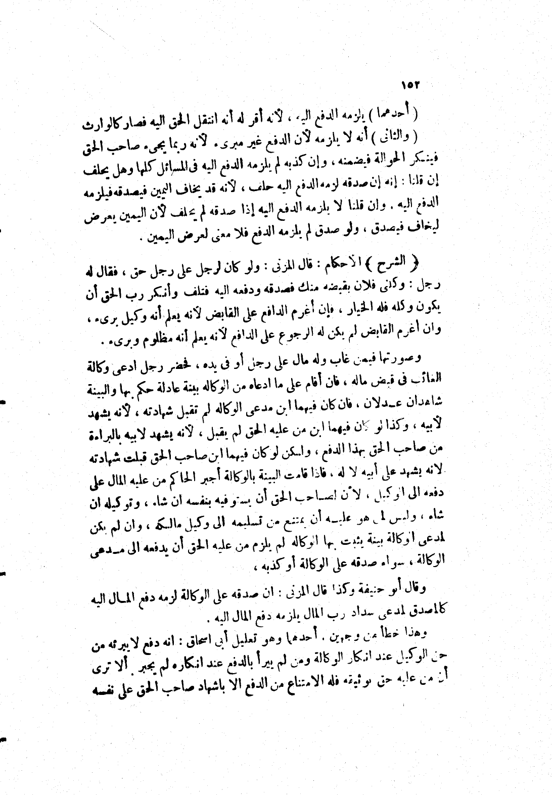 وصورتها فيمن غاب وله مال على رجل أو في يده، فحضر رجل ادعى وكالة الغائب في قبض ماله، فان أقام على ما ادعاه من الوكالة بينة عادلة حكم بها والبينة شاهدان عدلان، فان كان فيهما ابن مدعى الوكالة لم تقبل شهادته، لانه يشهد لابيه، وكذا لو كان فيهما ابن من عليه الحق لم يقبل، لانه يشهد لابيه بالبراءة من صاحب الحق بهذا الدفع، ولكن لو كان فيهما ابن صاحب الحق قبلت شهادته لانه يشهد على أبيه لا له، فإذا قامت البينة بالوكالة أجبر الحاكم من عليه المال على دفعه إلى الوكيل، لان لصاحب الحق أن يستوفيه بنفسه ان شاء، وتوكيله ان شاء، وليس لمن هو عليه أن يمتنع من تسليمه إلى وكيل مالكه، وان لم يكن لمدعى الوكالة بينة يثبت بها الوكالة لم يلزم من عليه الحق أن يدفعه إلى مدعى الوكالة، سواء صدقه على الوكالة أو كذبه، وقال أبو حنيفة وكذا قال المزني: ان صدقه على الوكالة لزمه دفع المال إليه كالمصدق لمدعى سداد رب المال يلزمه دفع المال إليه.