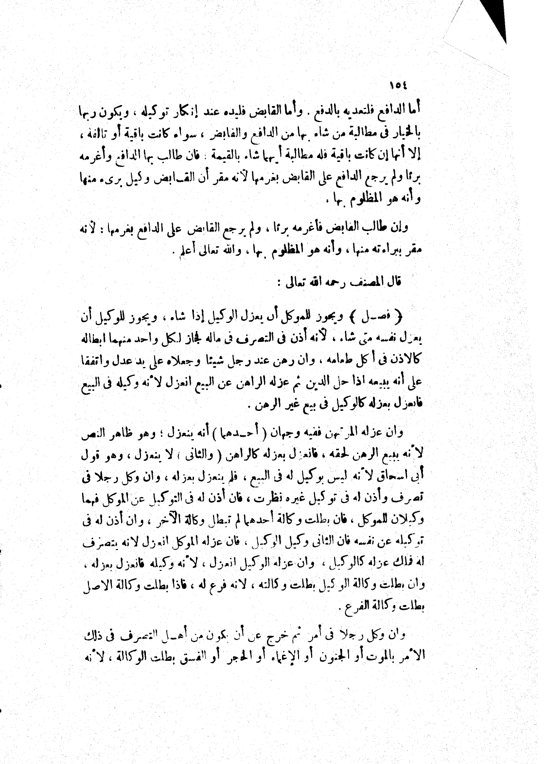 وأما القابض فليده عند إنكار توكيله، ويكون ربها بالخيار في مطالبة من شاء بها من الدافع والقابض، سواء كانت باقية أو تالفة، إلا أنها إن كانت باقية فله مطالبة أيهما شاء بالقيمة: فان طالب بها الدافع وأغرمه برئا ولم يرجع الدافع على القابض بغرمها لانه مقر أن القابض وكيل برئ منها وأنه هو المظلوم بها.