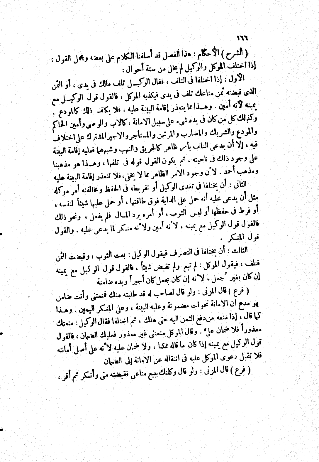 (الشرح) الاحكام: هذا الفصل قد أسلفنا الكلام على بعضه ومجمل القول: إذا اختلف الموكل والوكيل لم يخل من ستة أحوال: الاول: إذا اختلفا في التلف، فقال الوكيل تلف مالك في يدى، أو الثمن الذى قبضته ثمن متاعك تلف في يدى فيكذبه الموكل، فالقول قول الوكيل مع يمينه لانه أمين.
