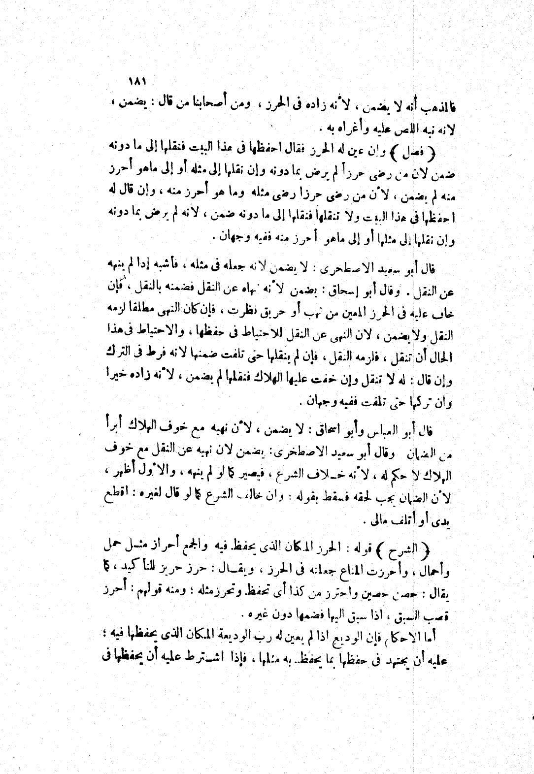 (الشرح) قوله: الحرز المكان الذى يحفظ فيه والجمع أحراز مثل حمل وأحمال، وأحرزت المتاع جعلته في الحرز، ويقال: حرز حريز للتأكيد، كما يقال: حصن حصين واحترز من كذا أي تحفظ وتحرز مثله، ومنه قولهم: أحرز قصب السبق، إذا سبق إليها فضمها دون غيره.