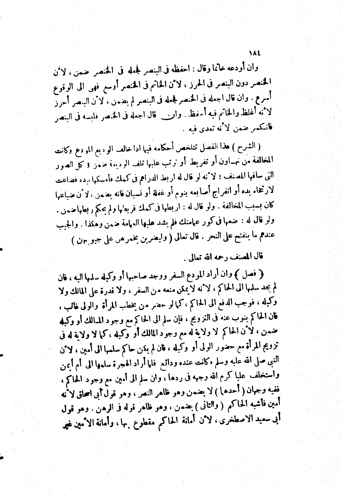 (الشرح) هذا الفصل تتلخص أحكامه فيما إذا خالف الوديع المودع وكانت المخالفة من تهاون أو تفريط أو ترتب عليها تلف الوديعة ضمن في كل الصور التى ساقها المصنف، لانه لو قال له اربط الدراهم في كمك فأمسكها بيده فضاعت لارتخاء يده أو انفراج أصابعه بنوم أو غفلة أو نسيان فانه يضمن، لان ضياعها كان بسبب المخالفة.