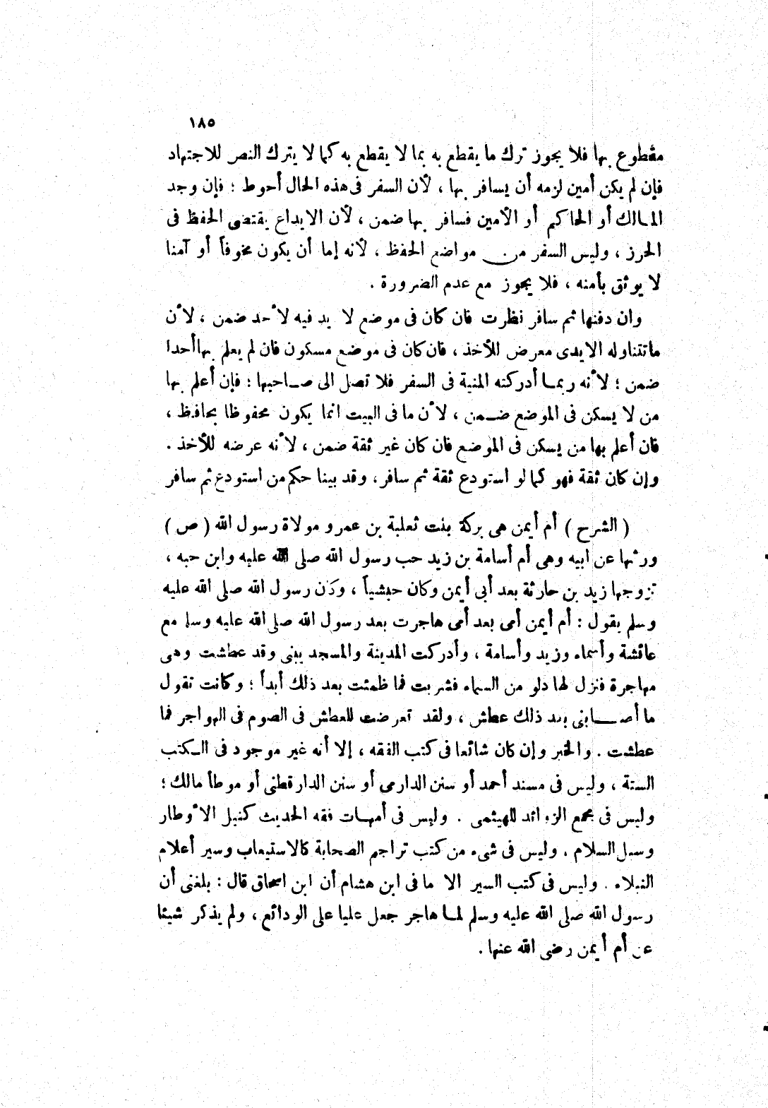 وإن كان ثقة فهو كما لو استودع ثقة ثم سافر، وقد بينا حكم من استودع ثم سافر (الشرح) أم أيمن هي بركة بنت ثعلبة بن عمرو مَوْلَاةُ رَسُولِ اللَّهِ صَلَّى اللَّهُ عَلَيْهِ وَسَلَّمَ ورثها عن ابيه وهى أم أسامة بن زيد حب رسول الله صلى الله عليه وابن حبه، تزوجها زيد بن حارثة بعد أبى أيمن وكان حبشيا، وَكَانَ رَسُولُ اللَّهِ صَلَّى اللَّهُ عَلَيْهِ وَسَلَّمَ يَقُولُ: أم أيمن أمي بعد أمي هاجرت بَعْدَ رَسُولِ اللَّهِ صَلَّى اللَّهُ عَلَيْهِ وَسَلَّمَ مَعَ عائشة وأسماء وزيد وأسامة، وأدركت المدينة والمسجد يبنى وقد عطشت وهى مهاجرة فنزل لها دلو من السماء فشربت فما ظمئت بعد ذلك أبدا، وكانت تقول ما أصابني بعد ذلك عطش، ولقد تعرضت للعطش في الصوم في الهواجر فما عطشت.