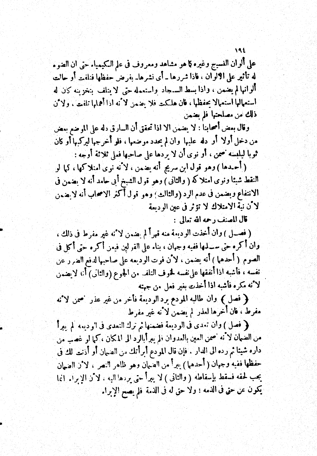 على ألوان النسيج وغيره كما هو مشاهد ومعروف في علم الكيمياء حتى ان الضوء له تأثير على الالوان، فإذا شررها - أي نشرها - بفرض حفظها فتلفت أو حالت ألوانها لم يضمن، وإذا بسط السجاد واستعمله حتى لا يتلف بتخزينه كان له استعمالها استعمالا يحفظها، فان هلكت فلا يضمن لانه إذا أهملها تلفت، ولان ذلك من مصلحتها فلم يضمن وقال بعض أصحابنا: لا يضمن الا إذا تحقق أن السارق دله على الموضع بعض من دخل أولا أو دله عليها وان لم يحدد موضعها، فلو أخرجها ليركبها أو كان ثوبا ليلبسه ضمن، أو نوى أن لا يردها على صاحبها فعلى ثلاثة أوجه: (أحدها) وهو قول ابن سريج أنه يضمن، لانه نوى امتلاكها، كما لو التقط شيئا ونوى امتلاكه