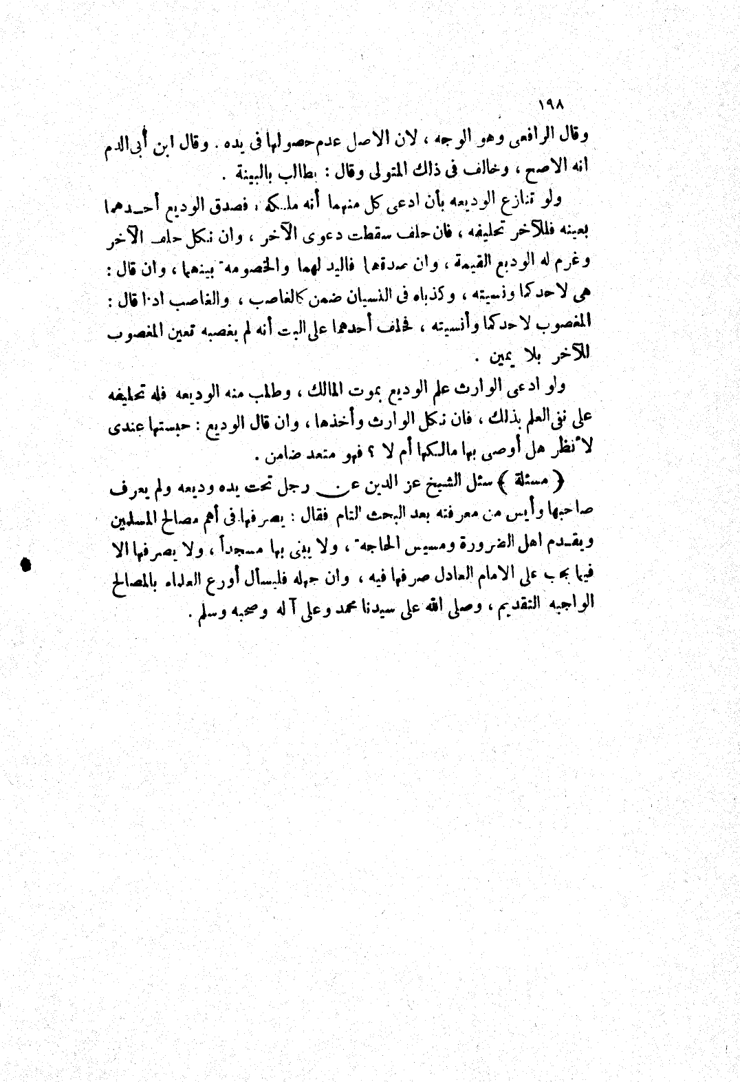 سئل الشيخ عز الدين عن رجل تحت يده وديعه ولم يعرف صاحبها وأيس من معرفته بعد البحث التام فقال: يصرفها في أهم مصالح المسلمين ويقدم اهل الضرورة ومسيس الحاجة، ولا يبنى بها مسجدا، ولا يصرفها الا فيما يجب على الامام العادل صرفها فيه، وان جهله فليسأل أورع العلماء بالمصالح الواجبة التقديم، وصلى الله على سيدنا محمد وعلى آله وصحبه وسلم.
