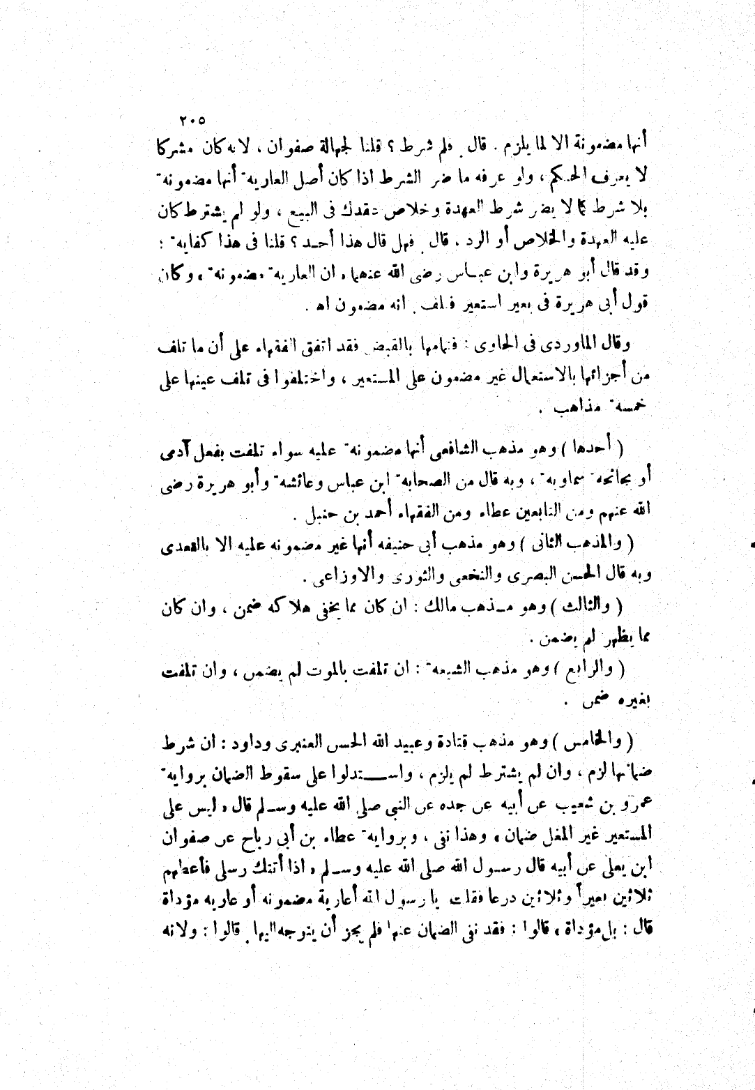 (والخامس) وهو مذهب قتادة وعبيد الله الحسن العنبري وداود: ان شرط ضمانها لزم، وان لم يشترط لم يلزم، واستدلوا على سقوط الضمان بِرِوَايَةِ عَمْرِو بْنِ شُعَيْبٍ عَنْ أَبِيهِ عَنْ جَدِّهِ عَنْ النَّبِيِّ صَلَّى اللَّهُ عَلَيْهِ وَسَلَّمَ قَالَ " ليس على المستعير غير المغل ضمان " وهذا نفى، وبرواية عطاء بن أبى رباح عن صفوان ابن يعلى عن أبيه قَالَ رَسُولُ اللَّهِ صَلَّى اللَّهُ عَلَيْهِ وَسَلَّمَ " إذا أتتك رسلي فأعطهم ثلاثين بعيرا وثلاثين درعا فقلت يا رسول الله أعارية مضمونه أو عاريه مؤداة قال: بل مؤداة " قالوا: فقد نفى الضمان عنها فلم يجز أن يتوجه إليها قالوا: ولانه