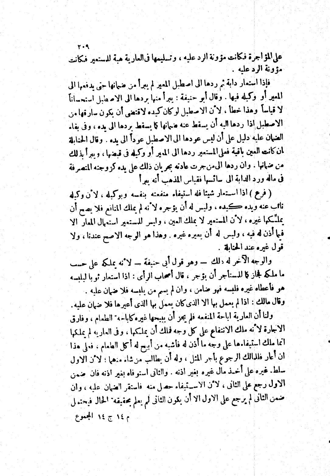 وقال مالك: إذا لم يعمل بها الا الذى كان يعمل بها الذى أعيرها فلا ضمان عليه.