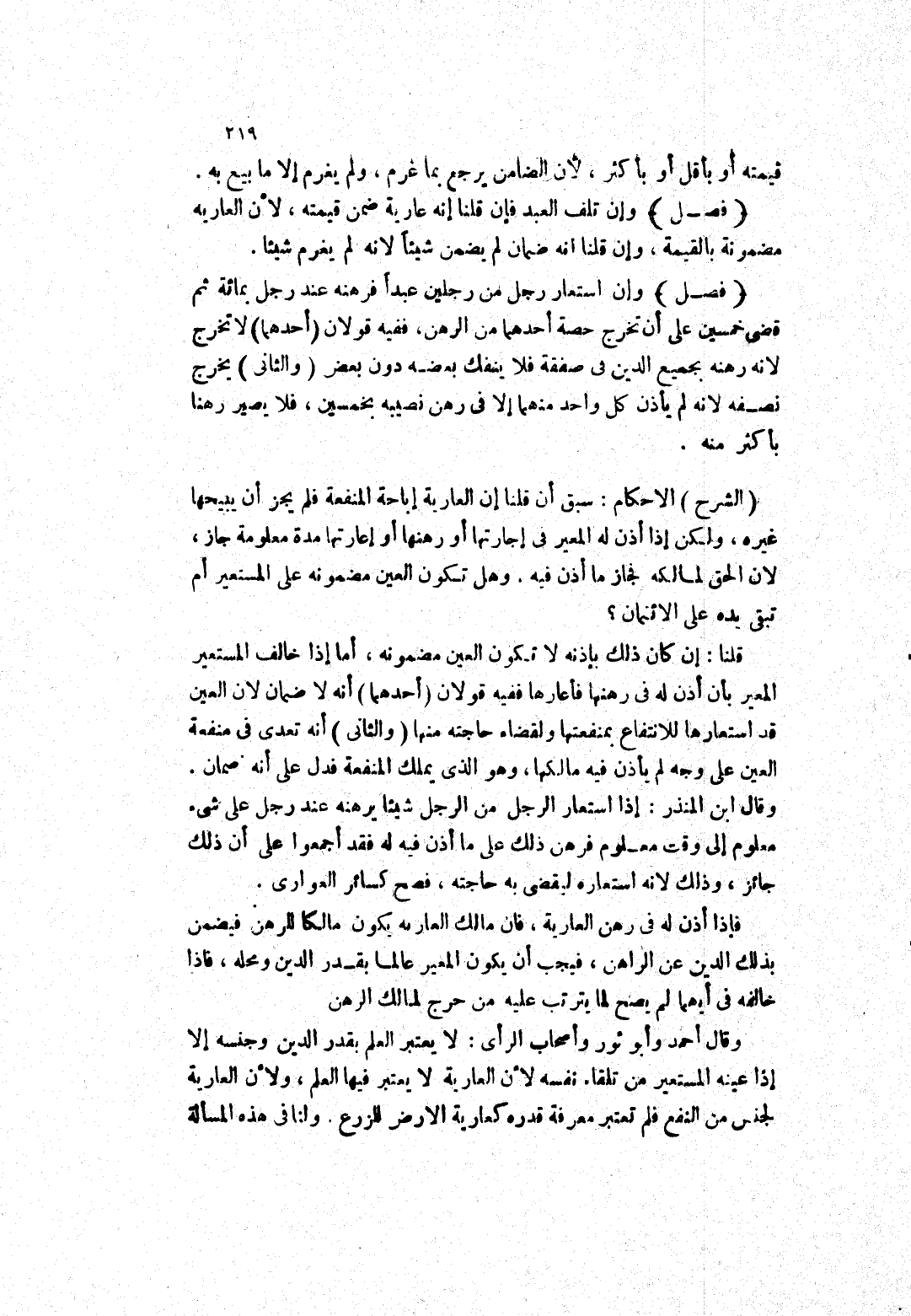 خالفه في أيهما لم يصح لما يترتب عليه من حرج لمالك الرهن وقال أحمد وأبو ثور وأصحاب الرأى: لا يعتبر العلم بقدر الدين وجنسه إلا إذا عينه المستعير من تلقاء نفسه لان العارية لا يعتبر فيها العلم، ولان العارية لجنس من النفع فلم تعتبر معرفة قدره كعارية الارض للزرع.