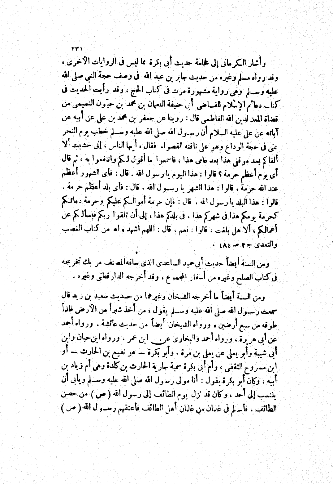 وأشار الكرماني إلى فخامة حديث أبى بكرة مما ليس في الروايات الاخرى، وقد رواه مسلم وغيره من حديث جابر بن عبد الله في وصف حجة النبي صلى الله عليه وسلم وهى رواية مشهورة مرت في كتاب الحج، وقد رأيت الحديث في كتاب دعائم الاسلام للقاضى أبى حنيفة النعمان بن محمد بن حيون التميمي من قضاة المعز لدين الله الفاطمي قال: روينا عن جعفر بن محمد بن على عن أبيه عن آبائه عن على عليه السلام أَنَّ رَسُولَ اللَّهِ صَلَّى اللَّهُ عَلَيْهِ وَسَلَّمَ خطب يوم النحر بمنى في حجة الوداع وهو على ناقته القصواء فقال " أيها الناس، إنى خشيت ألا