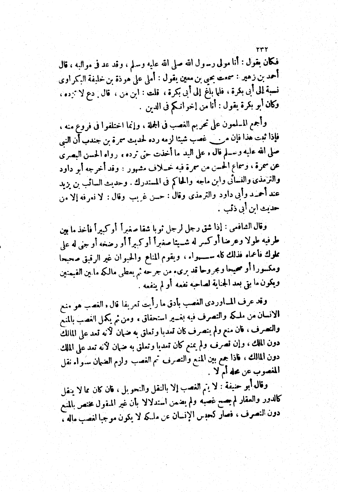 وأجمع المسلمون على تحريم الغصب في الجملة، وإنما اختلفوا في فروع منه، فإذا ثبت هذا فإن من غصب شيئا لزمه رده لحديث سَمُرَةَ بْنِ جُنْدُبٍ إنَّ النَّبِيَّ صَلَّى اللَّهُ عَلَيْهِ وَسَلَّمَ قَالَ " على اليد ما أخذت حتى ترده " رواه الحسن البصري عن سمرة، وسماع الحسن من سمرة فيه خلاف مشهور، وقد أخرجه أَبُو دَاوُد وَالتِّرْمِذِيُّ وَالنَّسَائِيُّ وَابْنُ مَاجَهْ وَالْحَاكِمُ في المستدرك.