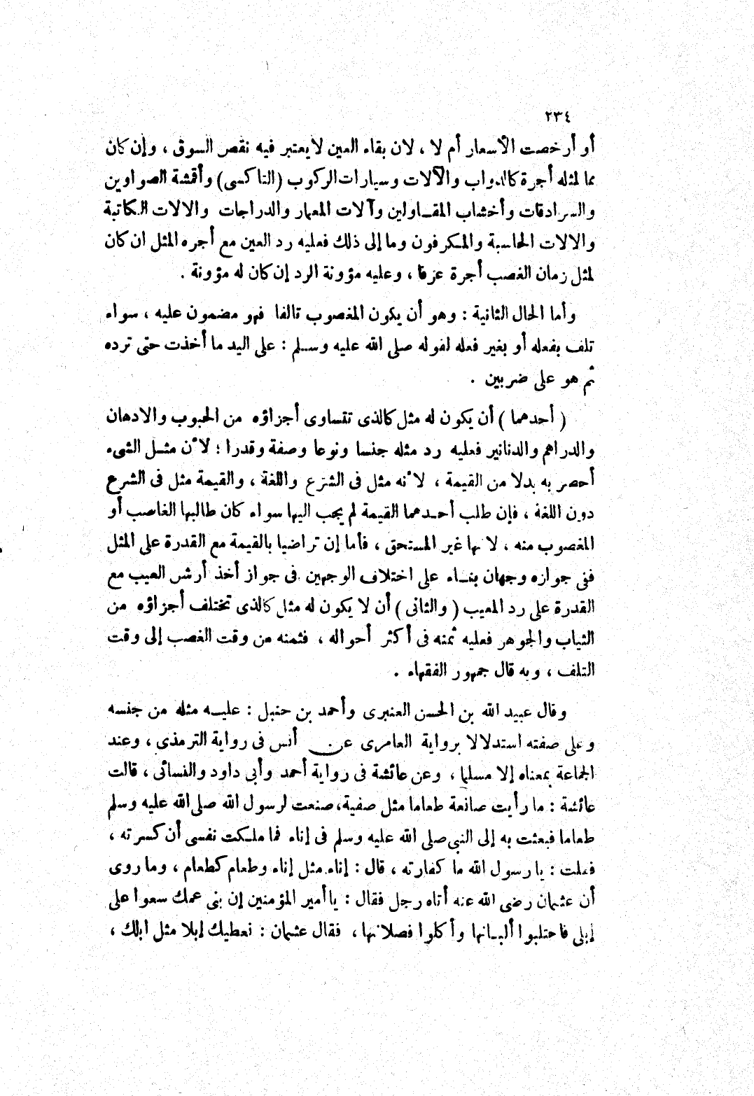 وعلى صفته استدلالا برواية العامري عن أنس في رواية الترمذي، وعند الجماعة بمعناه إلا مسلما، وعن عائشة في رواية أحمد وأبى داود والنسائي، قالت عائشة: ما رأيت صانعة طعاما مثل صفية، صَنَعْتُ لِرَسُولِ اللَّهِ صَلَّى اللَّهُ عَلَيْهِ وَسَلَّمَ طعاما فبعثت به إلى النبي صلى الله عليه وسلم في إناء فما ملكت نفسي أن كسرته، فقلت: يا رسول الله ما كفارته، قال: إناء مثل إناء وطعام كطعام، وما روى أن عثمان رضى الله عنه أتاه رجل فقال: يا أمير المؤمنين إن بنى عمك سعوا على إبلى فاحتلبوا ألبانها وأكلوا فصلانها، فقال عثمان: نعطيك إبلا مثل ابلك،