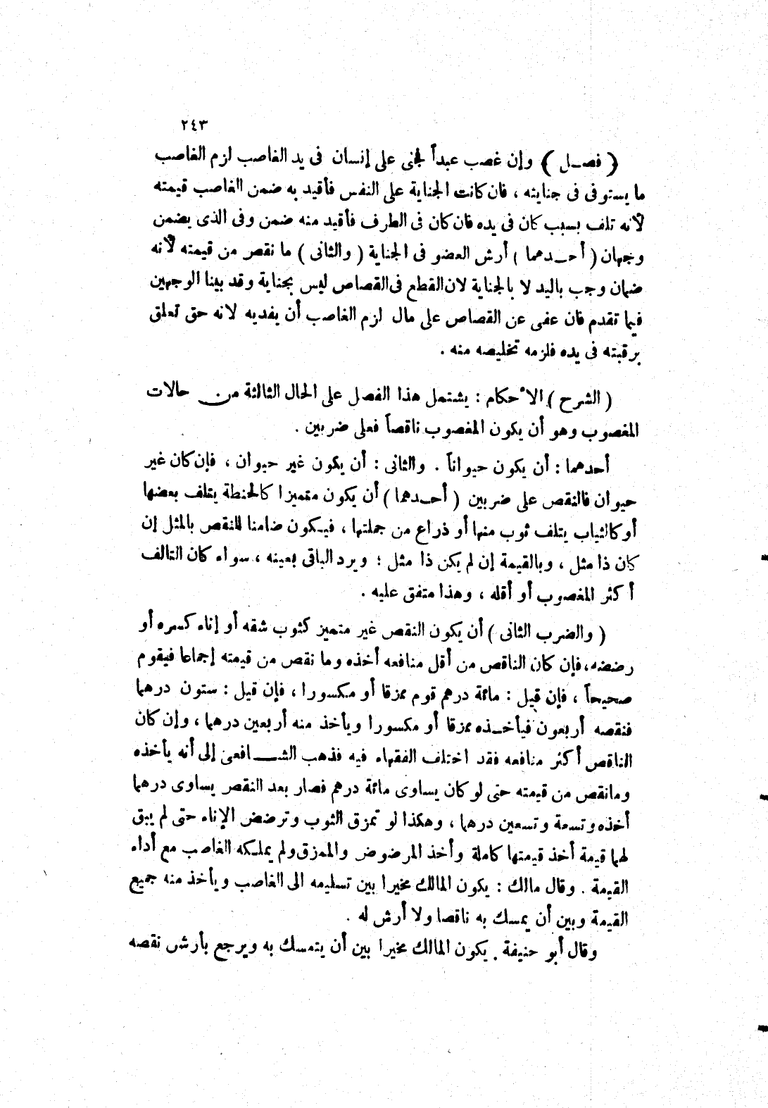 (الشرح) الاحكام: يشتمل هذا الفصل على الحال الثالثة من حالات المغصوب وهو أن يكون المغصوب ناقصا فعلى ضربين.