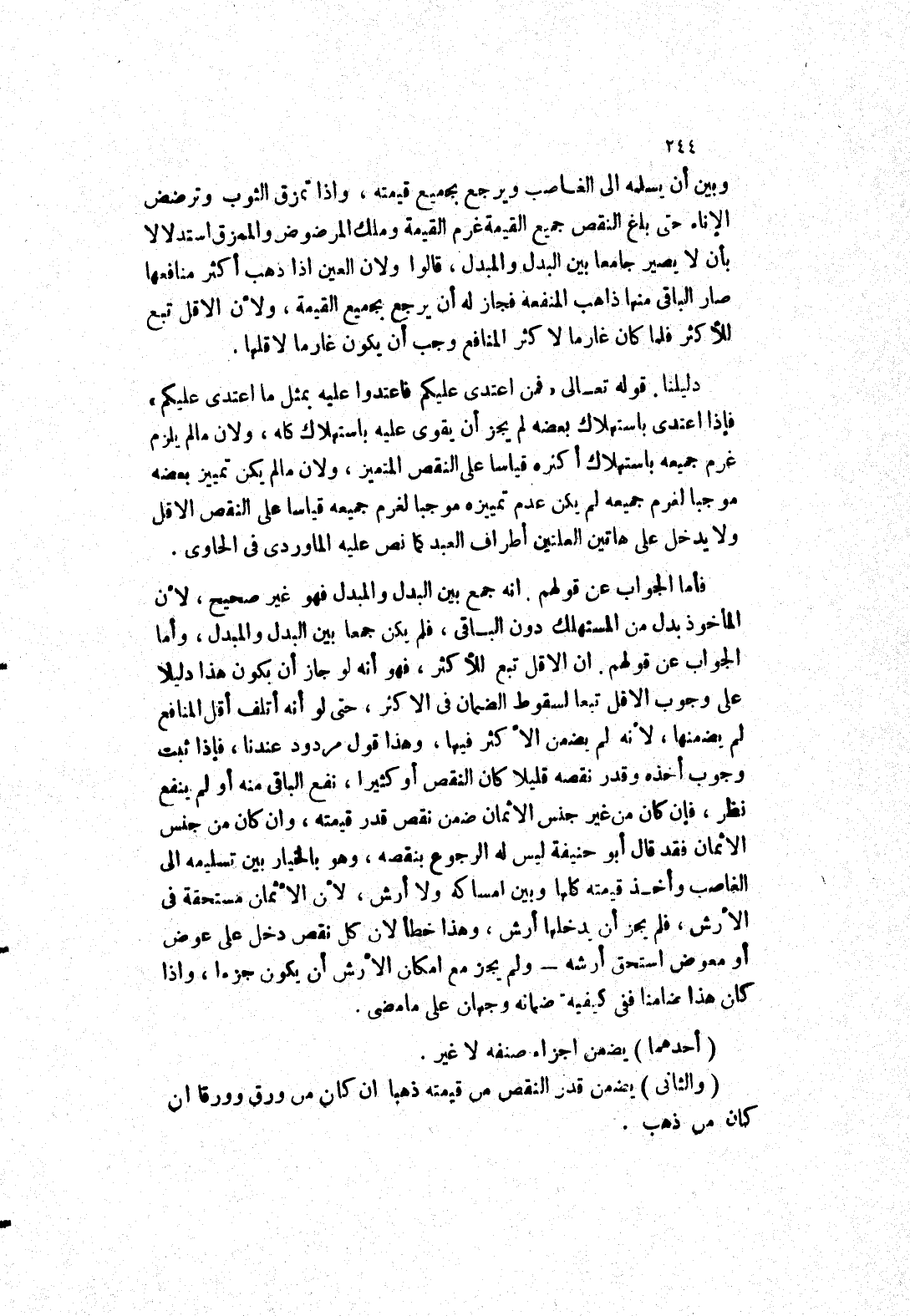 قوله تعالى " فمن اعتدى عليكم فاعتدوا عليه بمثل ما اعتدى عليكم " فإذا اعتدى باستهلاك بعضه لم يجز أن يقوى عليه باستهلاك كله، ولان ما لم يلزم غرم جميعه باستهلاك أكثره قياسا على النقص المتميز، ولان ما لم يكن تمييز بعضه موجبا لغرم جميعه لم يكن عدم تمييزه موجبا لغرم جميعه قياسا على النقص الاقل ولا يدخل على هاتين العلتين أطراف العبد كما نص عليه الماوردى في الحاوى.
