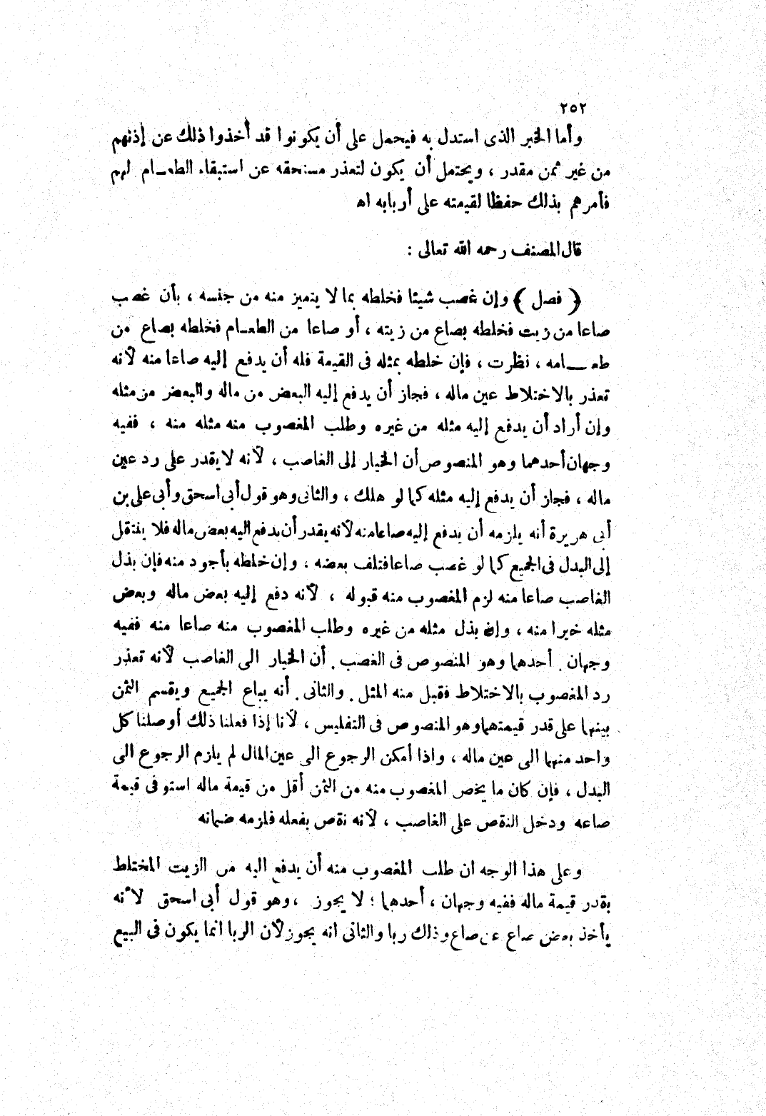 أنه يباع الجميع ويقسم الثمن بينهما على قدر قيمتهما وهو المنصوص في التفليس، لانا إذا فعلنا ذلك أوصلنا كل واحد منهما إلى عين ماله، وإذا أمكن الرجوع إلى عين المال لم يلزم الرجوع إلى البدل، فإن كان ما يخص المغصوب منه من الثمن أقل من قيمة ماله استوفى قيمة صاعه ودخل النقص على الغاصب، لانه نقص بفعله فلزمه ضمانه وعلى هذا الوجه ان طلب المغصوب منه أن يدفع إليه من الزيت المختلط بقدر قيمة ماله ففيه وجهان، أحدهما، لا يجوز، وهو قول أبى اسحق لانه يأخذ بعض صاع عن صاع وذلك ربا والثانى انه يجوز لان الربا انما يكون في البيع