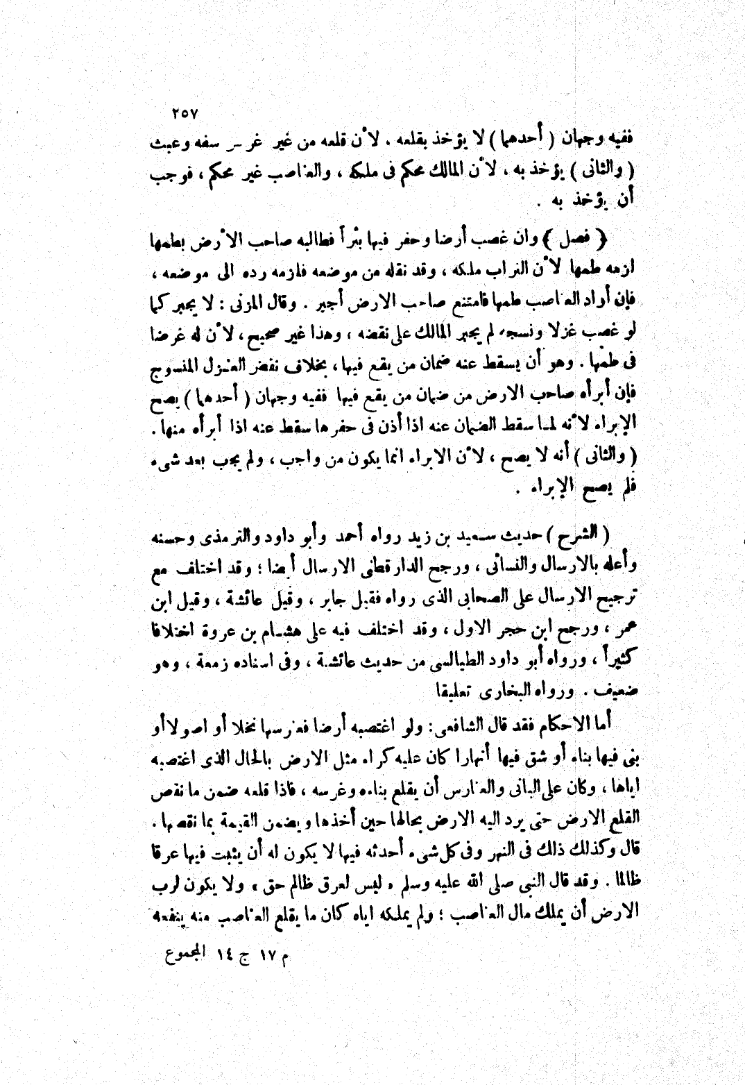 ورواه البخاري تعليقا أما الاحكام فقد قال الشافعي: ولو اغتصبه أرضا فغرسها نخلا أو اصولا أو بنى فيها بناء أو شق فيها أنهارا كان عليه كراء مثل الارض بالحال الذى اغتصبه اياها، وكان على البانى والغارس أن يقلع بناءه وغرسه، فإذا قلعه ضمن ما نقص القلع الارض حتى يرد إليه الارض بحالها حين أخذها ويضمن القيمة بما نقصها.