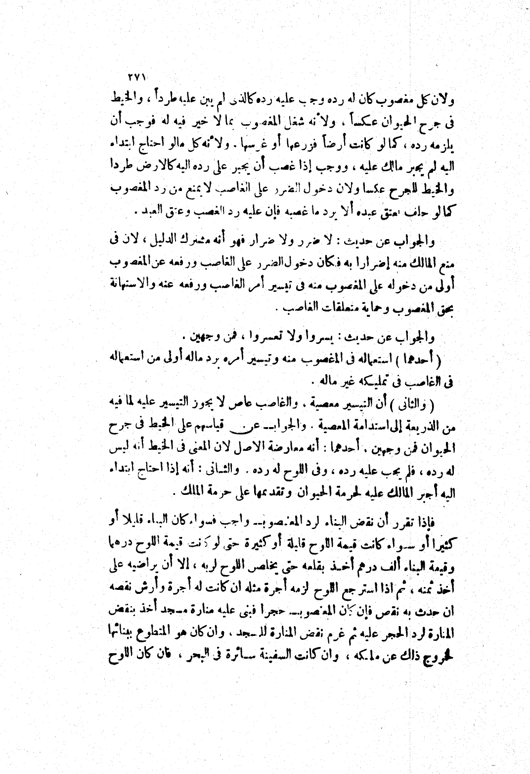والجواب عن حديث: لا ضرر ولا ضرار فهو أنه مشترك الدليل، لان في منع المالك منه إضرارا به فكان دخول الضرر على الغاصب ورفعه عن المغصوب أولى من دخوله على المغصوب منه في تيسير أمر الغاصب ورفعه عنه والاستهانة بحق المغصوب وحماية متعلقات الغاصب.