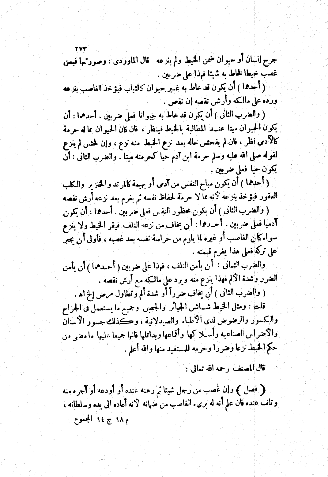 جرح إنسان أو حيوان ضمن الخيط ولم ينزعه، قال الماوردى: وصورتها فيمن غصب خيطا فخاط به شيئا فهذا على ضربين.