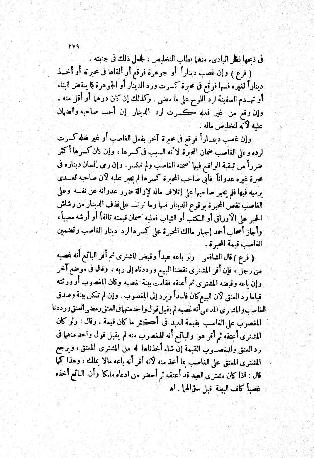 وإن رمى إنسان ديناره في محبرة غيره عدوانا فأبى صاحب المحبرة كسرها لم يجبر عليه لان صاحبه تعدى برميه فيها فلم يجبر صاحبها على إتلاف ماله لازالة ضرر عدوانه عن نفسه وعلى الغاصب نقص المحبرة بوقوع الدينار فيها وما ترتب على قذف الدينار من رشاش الحبر على الاوراق أو الكتب أو الثياب فعليه ضمان قيمته تالفا أو أرشه معيبا، وأجاز أصحاب أحمد إجبار مالك المحبرة على كسرها لرد دينار الغاصب وتضمين الغاصب قيمة المحبرة.