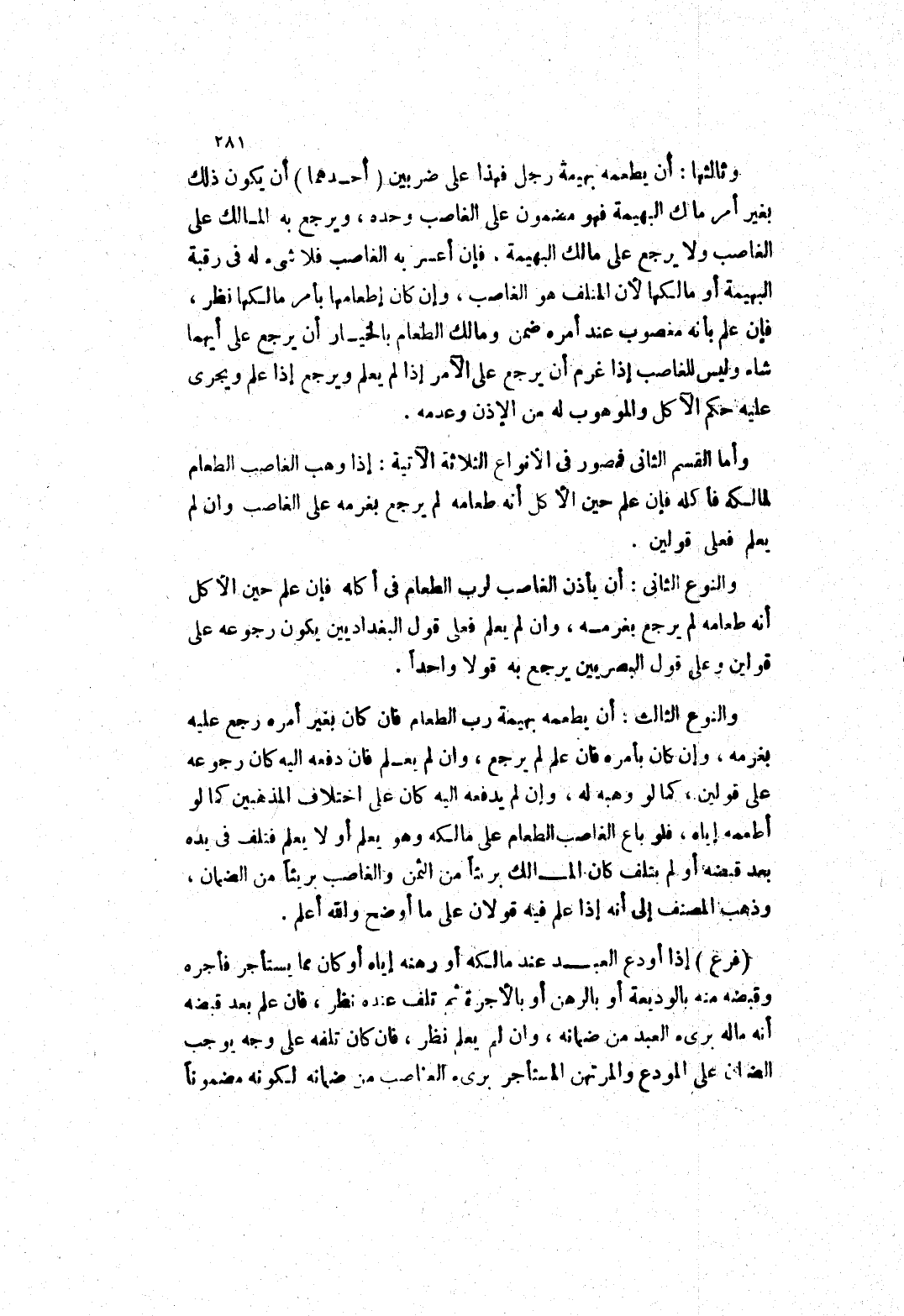 أن يكون ذلك بغير أمر مالك البهيمة فهو مضمون على الغاصب وحده، ويرجع به المالك على الغاصب ولا يرجع على مالك البهيمة، فإن أعسر به الغاصب فلا شئ له في رقبة البهيمة أو مالكها لان المتلف هو الغاصب، وإن كان إطعامها بأمر مالكها نظر، فإن علم بأنه مغصوب عند أمره ضمن ومالك الطعام بالخيار أن يرجع على أيهما شاء وليس للغاصب إذا غرم أن يرجع على الآمر إذا لم يعلم ويرجع إذا علم ويجرى عليه حكم الآكل والموهوب له من الاذن وعدمه.
