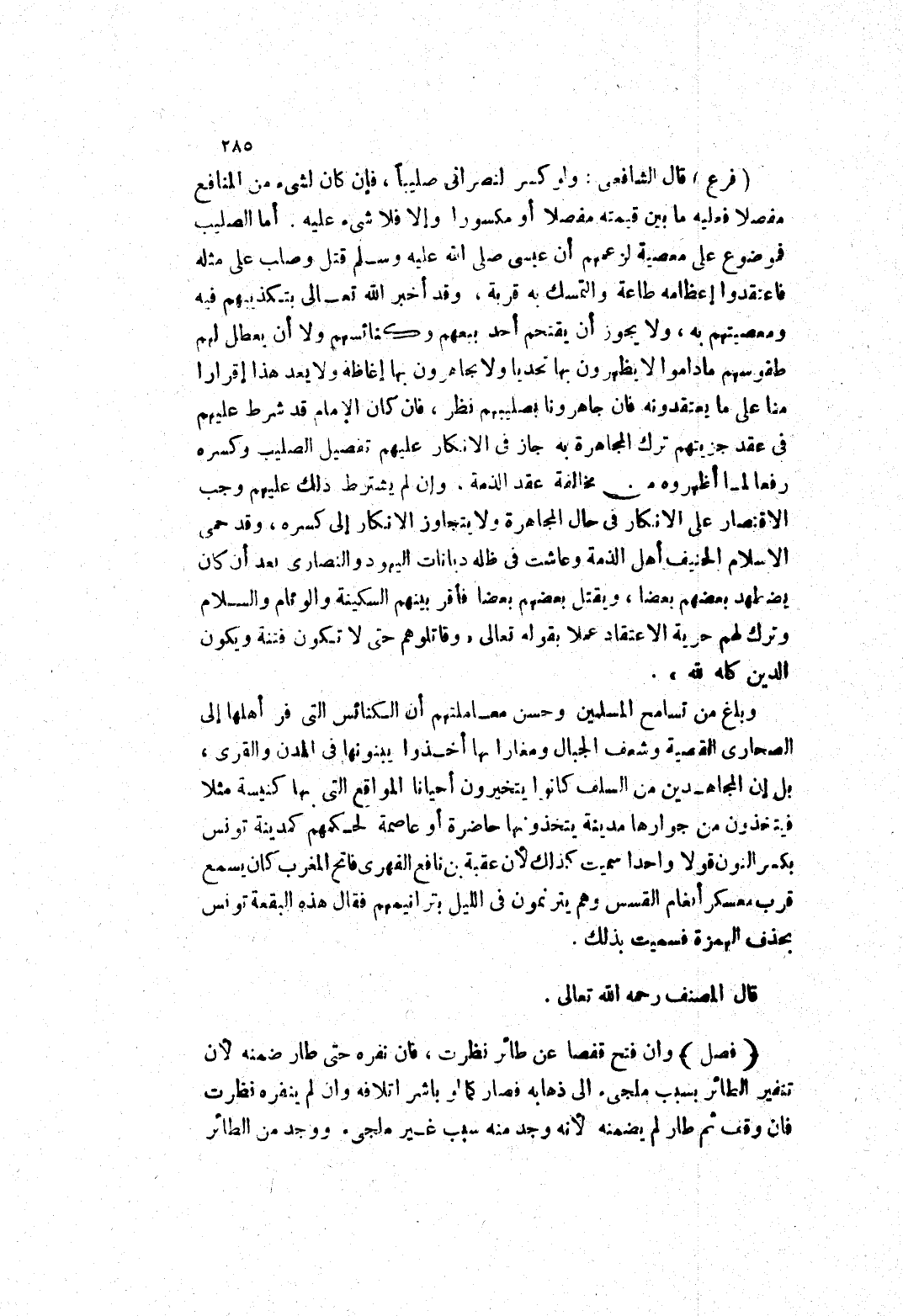 أما الصليب فموضوع على معصية لزعمهم أن عيسى صلى الله عليه وسلم قتل وصلب على مثله فاعتقدوا إعظامه طاعة والتمسك به قربة، وقد أخبر الله تعالى بتكذيبهم فيه ومعصيتهم به، ولا يجوز أن يقتحم أحد بيعهم وكنائسهم ولا أن يعطل لهم طقوسهم ما داموا لا يظهرون بها تحديا ولا يجاهرون بها إغاظة ولا يعد هذا إقرارا منا على ما يعتقدونه فان جاهرونا بصليبهم نظر، فان كان الامام قد شرط عليهم في عقد جزيتهم ترك المجاهرة به جاز في الانكار عليهم تفصيل الصليب وكسره رفعا لما أظهروه من مخالفة عقد الذمة، وإن لم يشترط ذلك عليهم وجب
