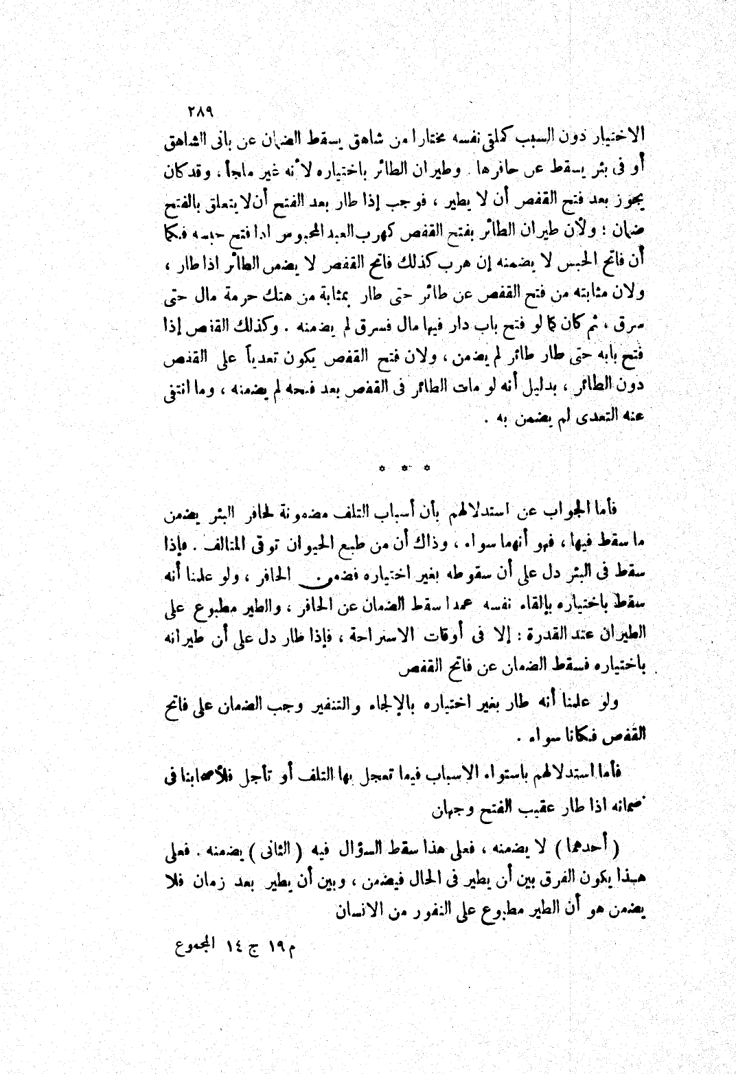 الاختيار دون السبب كملقى نفسه مختارا من شاهق يسقط الضمان عن بانى الشاهق أو في بئر يسقط عن حافرها.