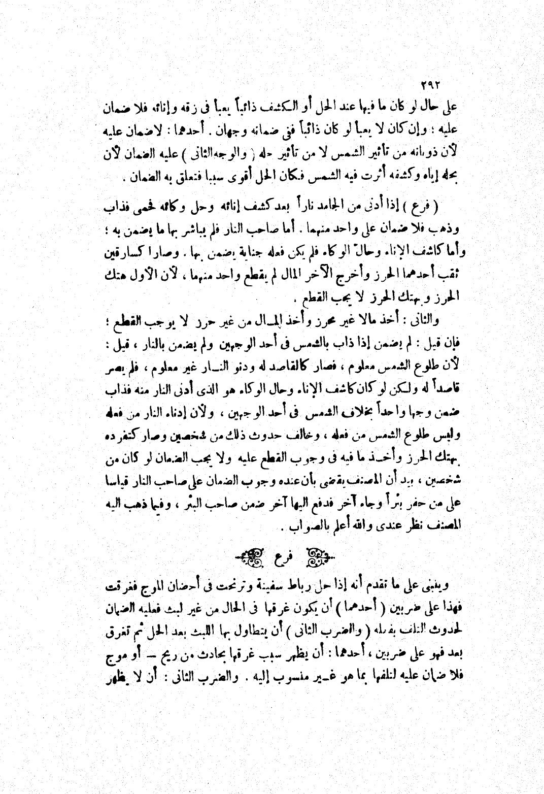 والثانى: أخذ مالا غير محرز وأخذ المال من غير حرز لا يوجب القطع، فإن قيل: لم يضمن إذا ذاب بالشمس في أحد الوجهين ولم يضمن بالنار، قيل: لان طلوع الشمس معلوم، فصار كالقاصد له ودنو النار غير معلوم، فلم يصر قاصدا له ولكن لو كان كاشف الاناء وحال الوكاء هو الذى أدنى النار منه فذاب ضمن وجها واحدا بخلاف الشمس في أحد الوجهين، ولان إدناء النار من فعله وليس طلوع الشمس من فعله، وخالف حدوث ذلك من شخصين وصار كتفرده بهتك الحرز وأخذ ما فيه في وجوب القطع عليه ولا يجب الضمان لو كان من شخصين، بيد أن المصنف يقضى بأن عنده وجوب الضمان على صاحب النار قياسا على من حفر بئرأ وجاء آخر فدفع إليها آخر ضمن صاحب البئر، وفيما ذهب إليه المصنف نظر عندي والله أعلم بالصواب.* (فرع)