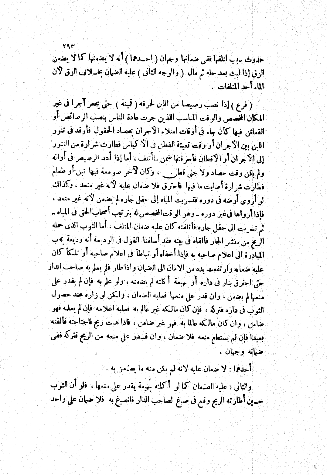 إذا نصب رصيصا من اللبن لحرقه (قمينة) حتى يجعر آجرا في غير المكان المخصص والوقت المناسب اللذين جرت عادة الناس بنصب الرصائص أو القمائن فيها كأن جاء في أوقات امتلاء الاجران بحصاد الحقول فأوقد في تنور اللبن بين الاجران أو وقت تعبئة القطن في الاكياس فطارت شرارة من النور إلى الاجران أو الاقطان فأحرقتها ضمن ما أتلف، أما إذا أعد الرصيص في أوانه ولم يكن وقت حصاد ولا جنى قطن، وكان لآخر صومعة فيها تبن أو طعام فطارت شرارة أصابت ما فيها فاحترق فلا ضمان عليه لانه غير متعد، وكذلك لو أروى أرضه في دوره فتسربت المياه إلى حقل جاره لم يضمن لانه غير متعد، فإذا أرواها في غير دوره - وهو الوقت المخصص له بترتيب أصحاب الحق في المياه - ثم تسربت إلى حقل جاره فأتلفته كان عليه ضمان المتلف، أما الثوب الذى حمله الريح من منشر الجار فألقاه في بيته فقد أسلفنا القول في الوديعة أنه وديعة يجب المبادرة إلى اعلام صاحبه به فإذا أخفاه أو تباطأ في اعلام صاحبه أو تلكأ كان عليه ضمانه وارتفعت يده من الامان إلى الضمان وإذا طار فلم يعلم به صاحب الدار حتى احترق بنار في داره أو بهيمة أكلته لم يضمنه، ولو علم به فإن لم يقدر على منعها لم يضمن، وان قدر على منعها فعليه الضمان، ولكن لو زاره عند حصول الثوب في داره فتركه، فإن كان مالكه غير عالم به فعليه اعلامه فإن لم يعلمه فهو ضامن، وان كان مالكه عالما به فهو غير ضامن، فإذا هبت ريح فاجتاحته فألقته