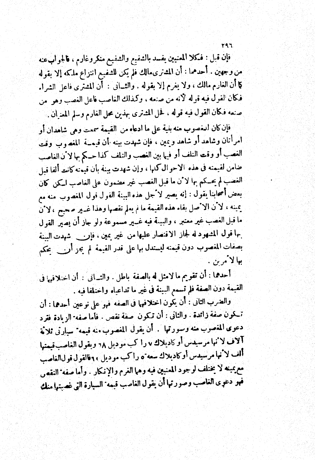 أن يقول المغصوب منه قيمة سيارتي ثلاثة آلاف لانها مرسيدس أو كاديلاك 7 راكب موديل 68 ويقول الغاصب قيمتها ألف لانها مرسيدس أو كاديلاك سعة 5 راكب موديل 69 فالقول قول الغاصب مع يمينه لا يختلف لوجود المعنيين فيه وهما الغرم والانكار.