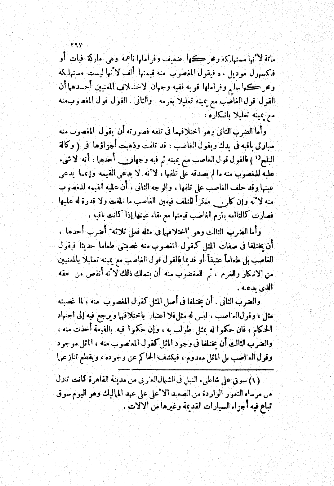 وأما الضرب الثاني وهو اختلافهما في تلفه فصورته أن يقول المغصوب منه سيارتي باقيه في يدك ويقول الغاصب، قد تلفت وذهبت أجزاؤها في (وكالة البلح (1)) فالقول قول الغاصب مع يمينه ثم فيه وجهان أحدهما، أنه لا شئ عليه للمغصوب منه ما لم يصدقه على تلفها، لانه لا يدعى القيمه وإنما يدعى عينها وقد حلف الغاصب على تلفها، والوجه الثاني، أن عليه القيمه للمغصوب منه لانه وإن كان منكرا للتلف فيمين الغاصب ما تلفت ولا قدرة له عليها فصارت كالتالفه يلزم الغاصب قيمتها مع بقاء عينها إذا كانت باقيه.